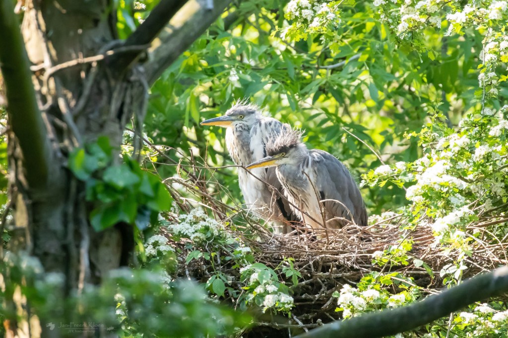 Kort daarna ontdekten we de echte kolonie. Er zaten verschillende nesten, ouders die met nestmateriaal sleepten en net uitgevlogen jongen die wat klungelig door de bomen en struiken klauterden. Een heel leuk gezicht!