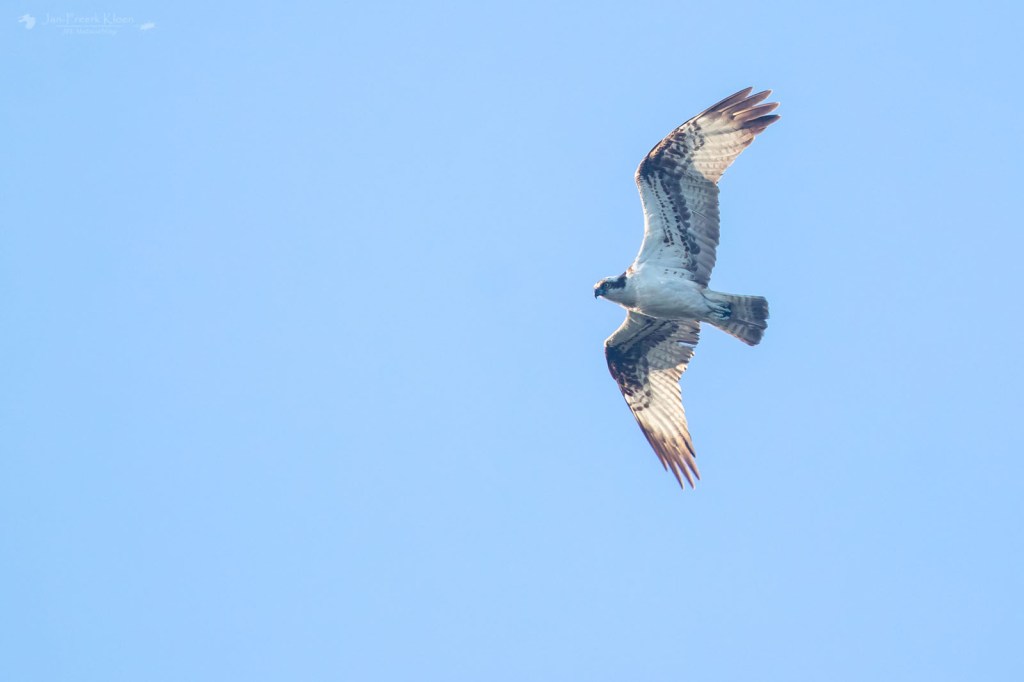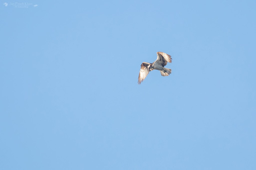 Maar ja, de rest van het kamp wilde hem ook nog zien en ik was natuurlijk niet naar de Weerribben gekomen om gelijk weer terug te gaan. De volgende ochtend stond de wekker dus vroeg om een paar uur te vertoeven bij een kijkscherm waar vaker otters rondzwemmen. Het was een prachtige ochtend. De zon scheen en verving al snel de ochtendkou voor een aangenaam temperatuurtje. Tijdens het wachten werden we bovendien prima vermaakt. Een visarend zat eerst aan de overkant van het water in een dode boom, maar ging na een tijdje op de wieken om al biddend boven ons hoofd een show weg te geven. Een paar keer dook hij tevergeefs, maar toen hij even verdween en later terugkwam vloog hij wel met een vis rond.