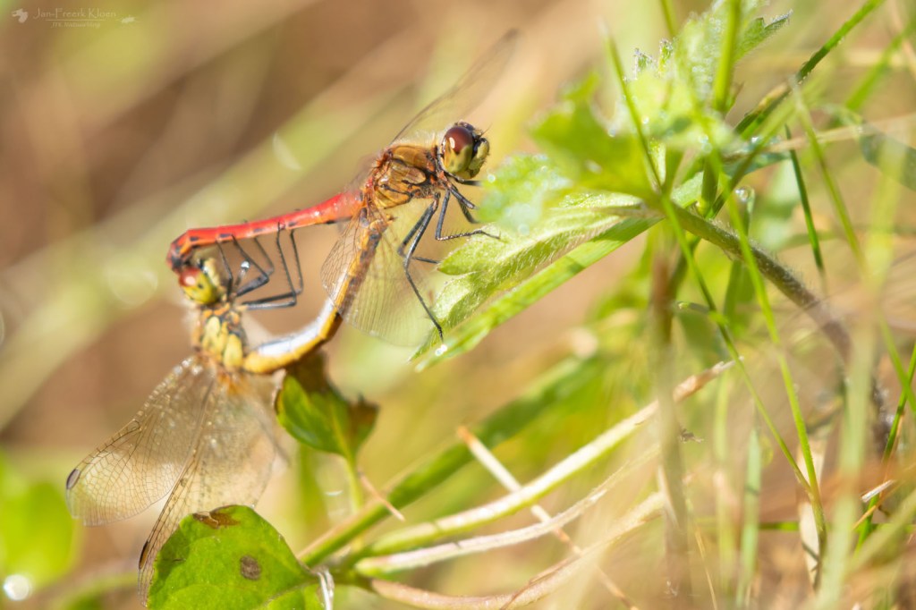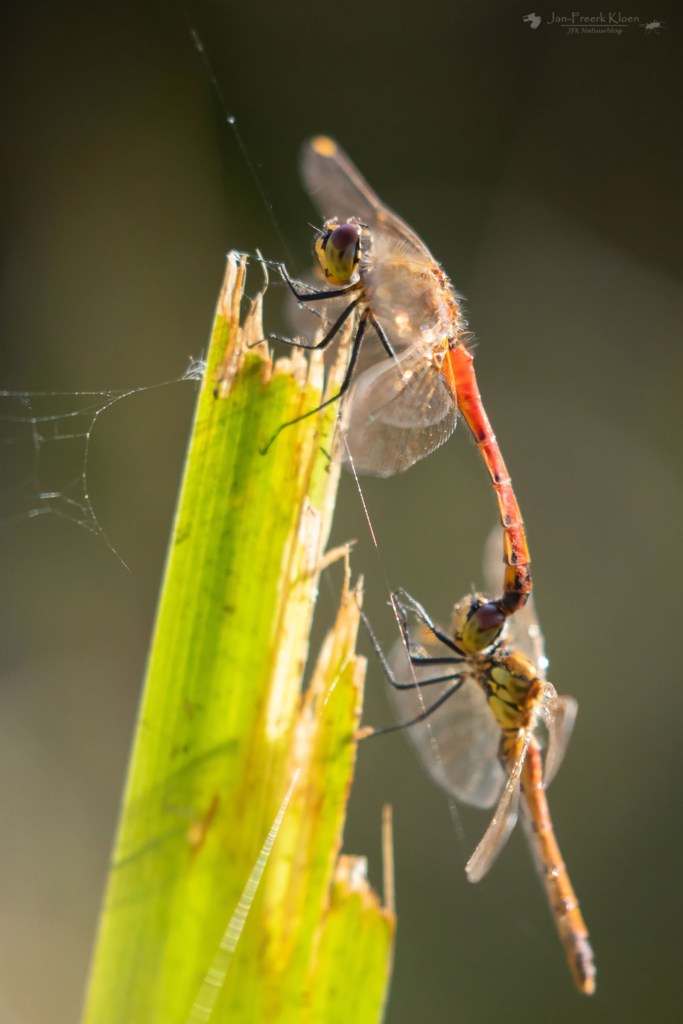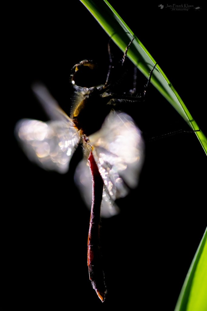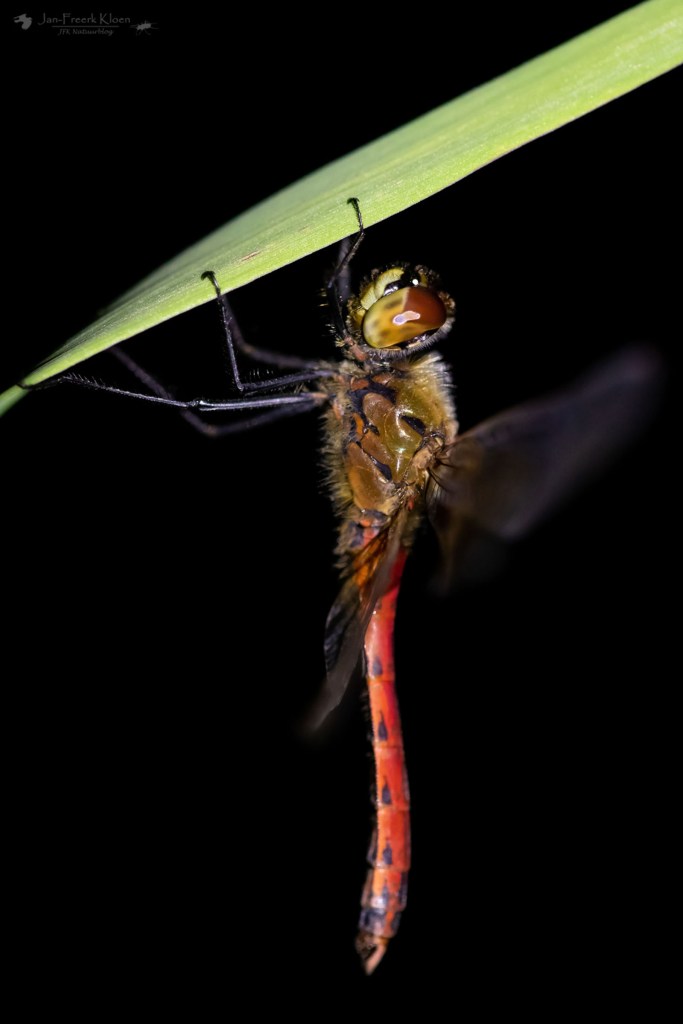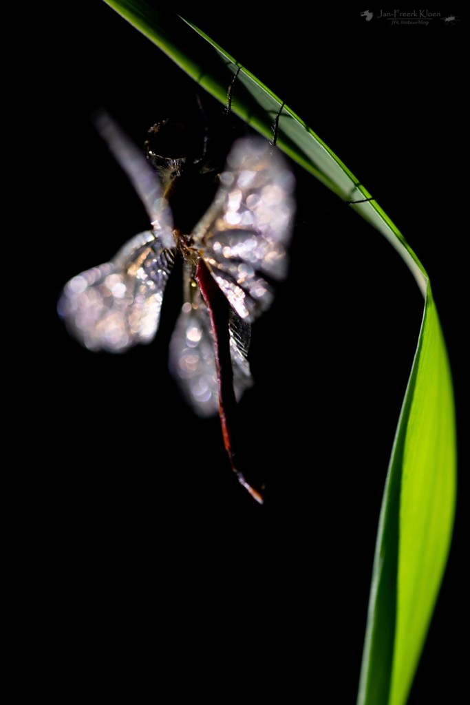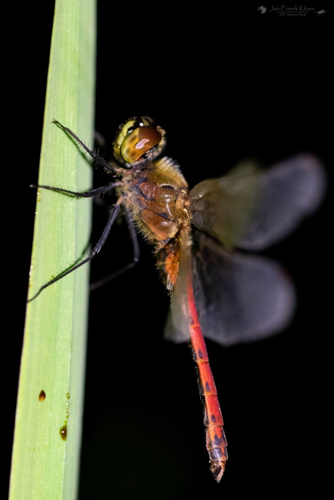 Voor mijzelf had ik later in de avond nog wat ander vermaak gevonden. Tijdens het avondeten had ik gezien dat er aardig wat kempense heidelibellen op de camping rondhingen in de wat hogere vegetatie van een productiegrasland. Het was rond zonsondergang, dus het kon bijna niet anders dan dat ze daar gingen slapen. Maar wie komt er nou op het idee om ’s nachts libellen te gaan fotograferen? Ik dus, ik wilde iets origineels. En dus ging ik nog niet naar bed, maar gewapend met een hoofdlamp en camera het veld in. De heidelibellen waren makkelijk te vinden en gaven uiteraard in de koude, donkere nacht geen krimp als ik in de buurt kwam. Het leverde heel wat fraaie plaatjes op, van duidelijke foto’s van de kenmerken tot creatieve tegenlichtplaatjes.