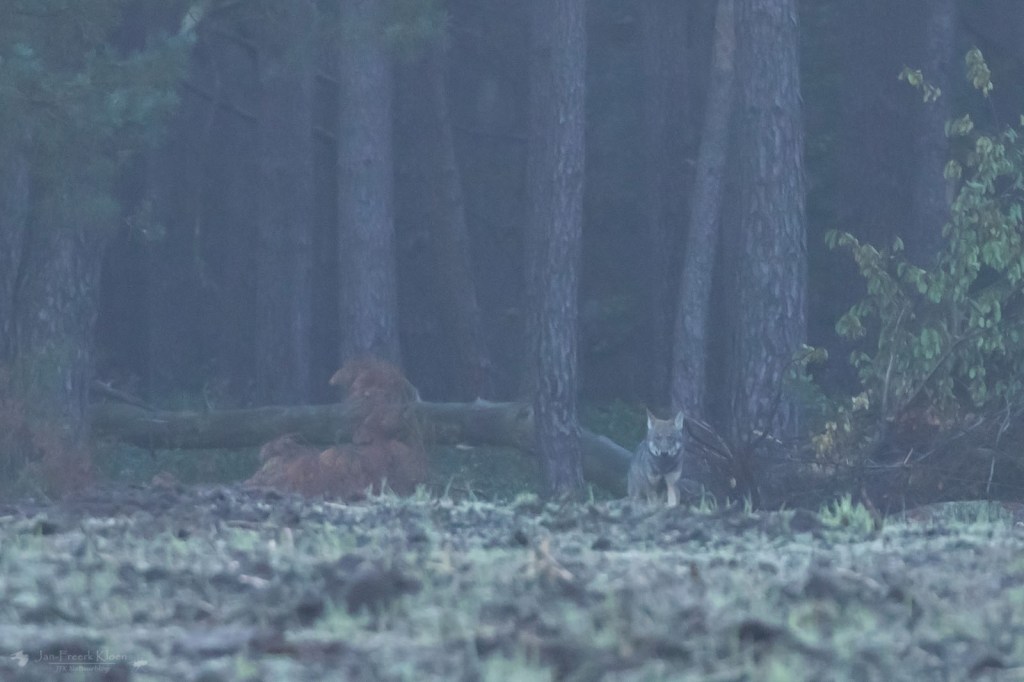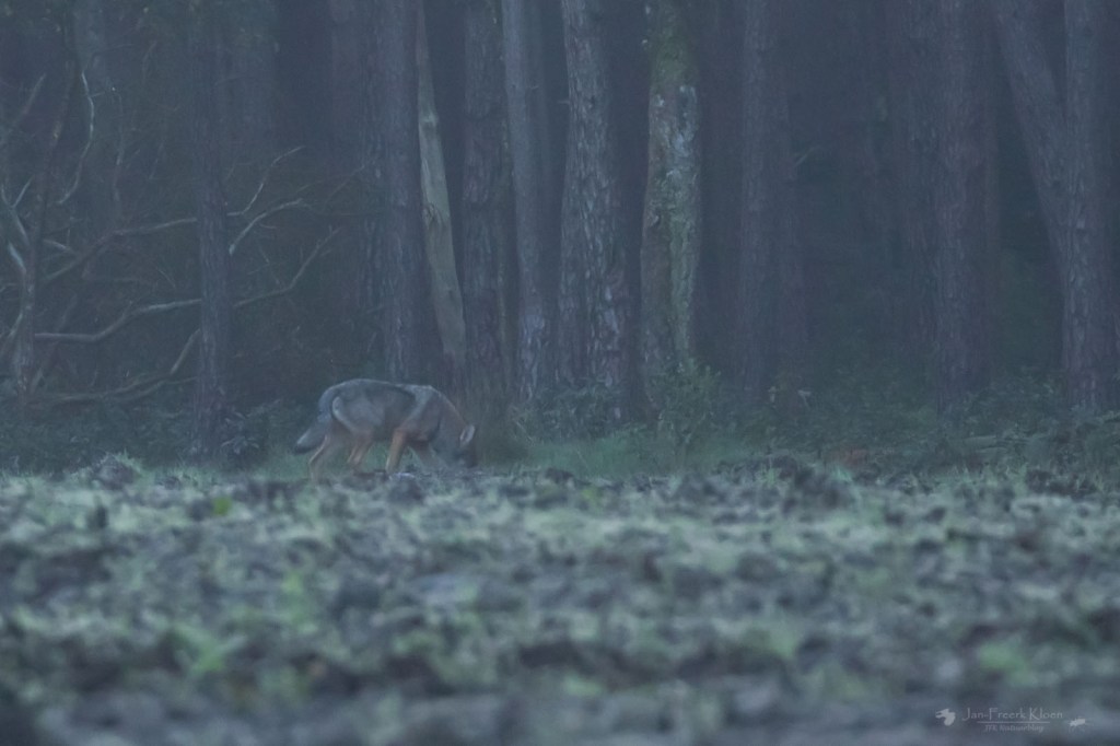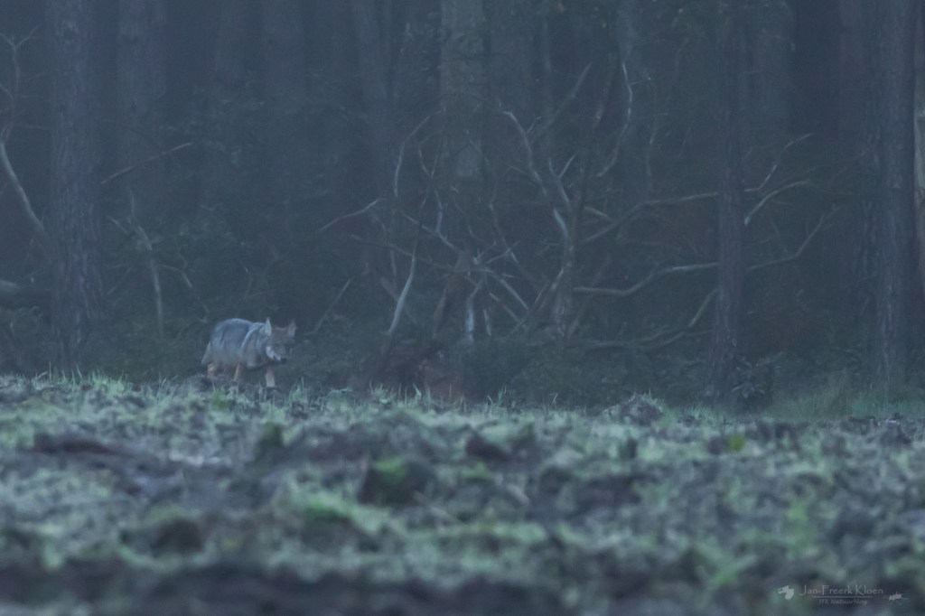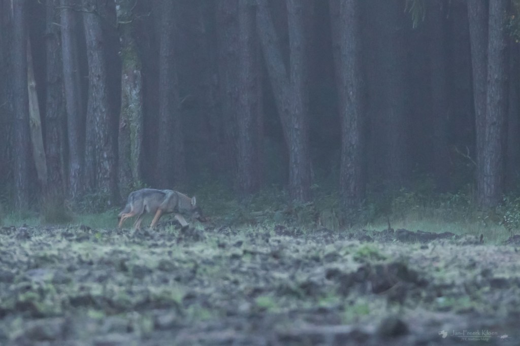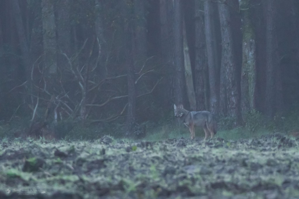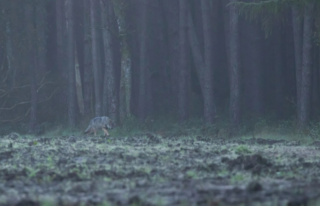 Na een minuutje de omgeving in de gaten gehouden te hebben pak ik mijn verrekijker om ook de wat nevelige achterrand van de open plek beter te kunnen zien. Ik richt mijn verrekijker en zie een grijs lichaam tussen de bomen bewegen. Een tel later vang ik nog een glimp op van het dier en ik zie het meteen. De manier van lopen, het silhouet. Op zijn gemakje komt de wolf het bos uit lopen. Veel te plotseling, na talloze vergeefse pogingen en nu is hij daar. Na slechts een minuut posten. Hier was ik niet op voorbereid. Ik weet niet hoe snel ik mijn camera moet pakken en als een gek erop los moet klikken.