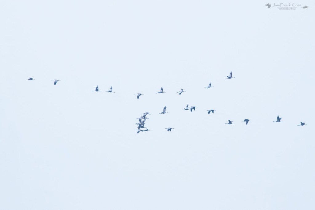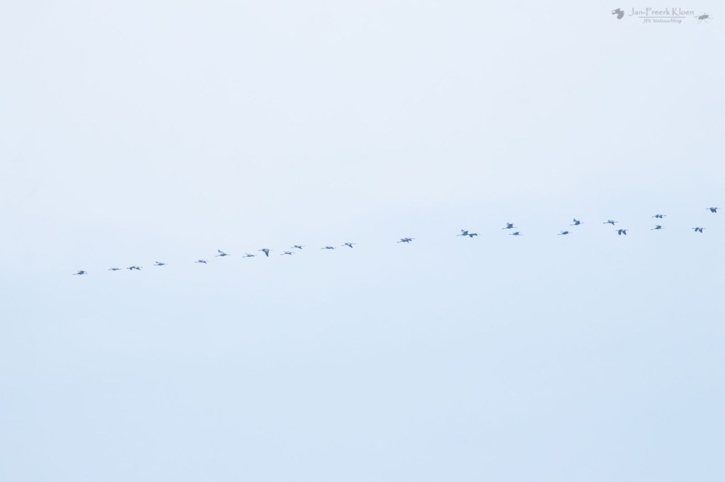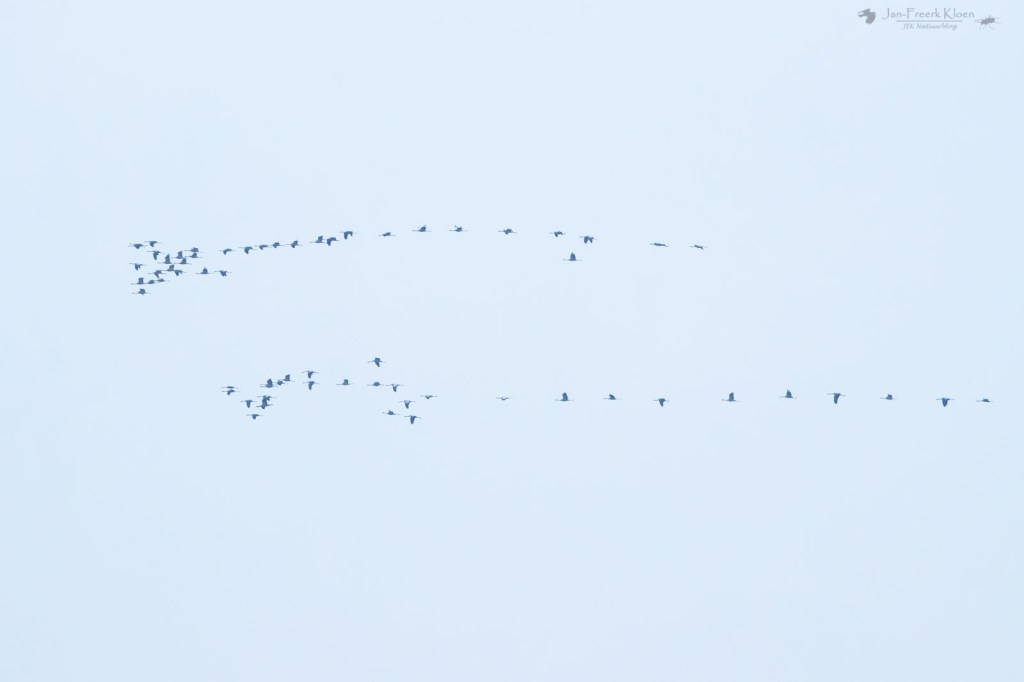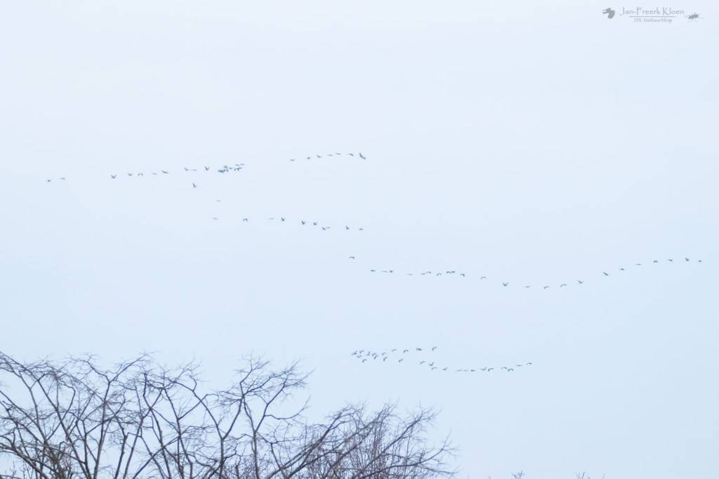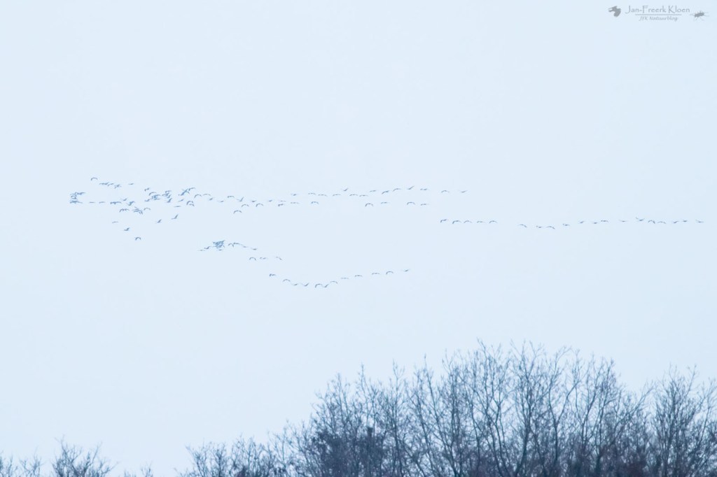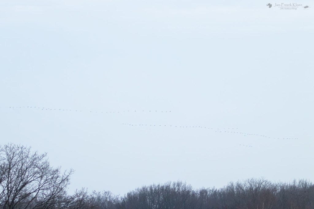 En ja, daar zagen we ze al aankomen. Heel ver weg nog, maar kraanvogels zijn grote vogels. En zo’n grote groep is dan bijna niet over het hoofd te zien. De groep bleek uit veel meer dan 200 exemplaren te bestaan, en was inmiddels gesplitst in twee grote groepen. Traag tegen de wind in, en continu hergroeperend trokken de kraanvogels over de vallei. Voor ons vrij ver weg, maar dankzij het uitzicht prachtig te zien. Ik zette alle delen van de groepen stuk voor stuk op de foto om achteraf te kunnen tellen hoeveel kraanvogels voorbij mijn huis vlogen. De teller kwam op maar liefst 369! Zoveel kraanvogels bij elkaar had ik hier in de omgeving nog nooit gezien! Het was zo enorm genieten met dat perfecte uitzicht. En dat gewoon bij huis. Het duurde wel een kwartier voor alle kraanvogels weer uit zicht verdwenen waren. Door de harde tegenwind zat er niet veel tempo in. Wat een geluk voor ons!