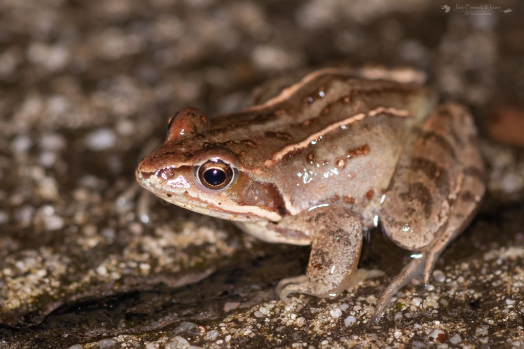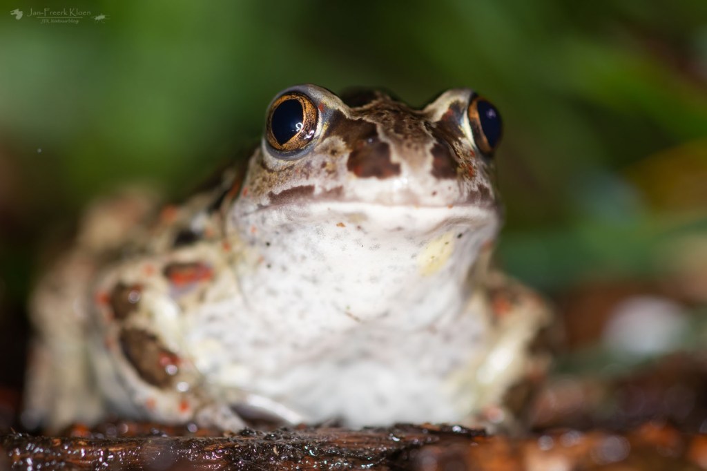 Op de heenweg moest ik al een paar keer flink in de remmen voor kikkers die door de regenbui naar buiten gelokt werden en de weg over sprongen: één poelkikker en één bastaardkikker onder andere. Maar daar ging het me natuurlijk niet om, dus voorzichtig reed ik snel door.