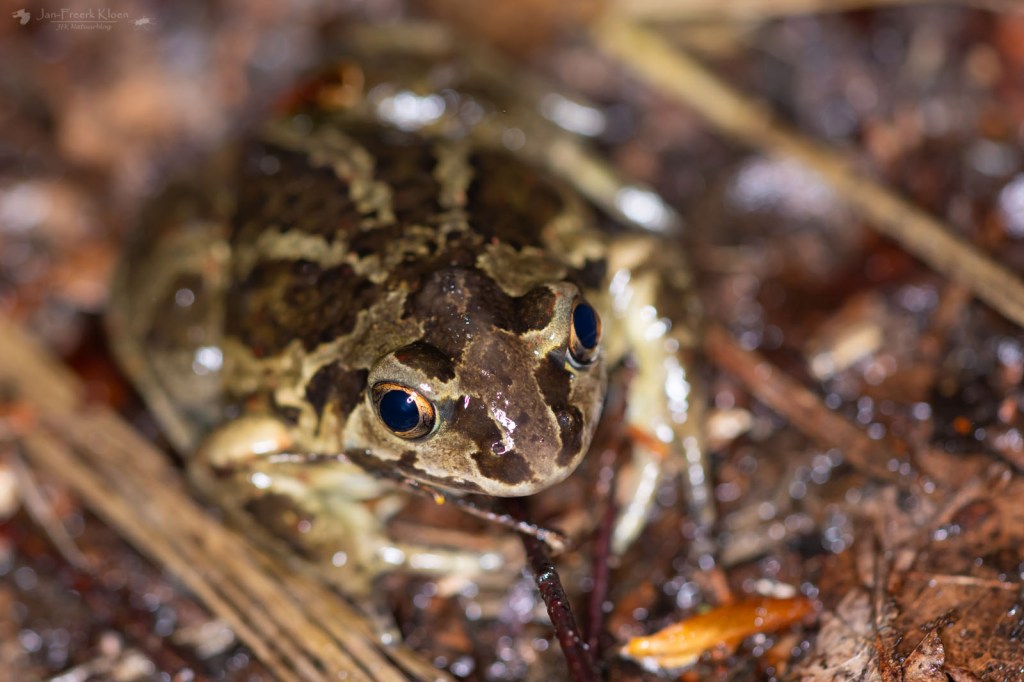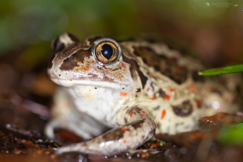 Vanaf het begin van het gebied moest ik verder lopen. En terecht. Want amper twee meter voorbij de slagboom zat de eerste knoflookpad. De eerste van de avond, en mijn eerste ooit. Wat was ik blij! En terwijl ik nog wat onhandig bezig was met al mijn zaklampen, hoofdlampen, ringflitser én paraplu om mijn camera soort van droog te houden kon ik het kleine padje prachtig bekijken.