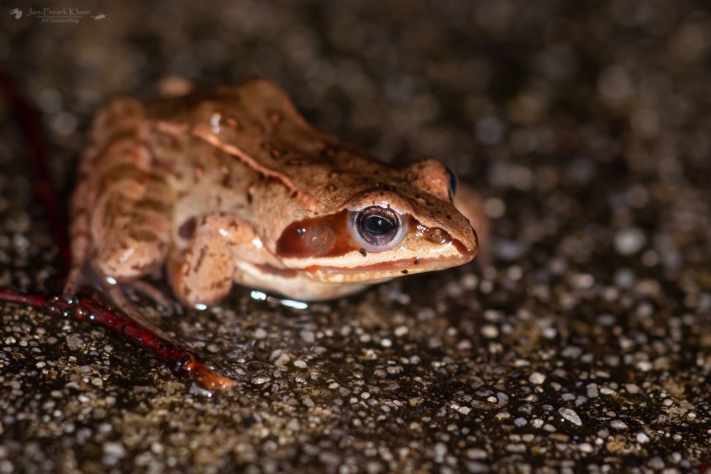 Maar we waren natuurlijk nog niet klaar. Eigenlijk pas net begonnen. We liepen verder over de weg en zagen verschillende kleine, nog niet volwassen kikkertjes. Eerst schold ik ze uit voor bruine kikkers, maar na een tijdje kwam ik tot inkeer en zag ik dat het allemaal jonge heikikkers waren. Deze twee lijken ontzettend veel op elkaar, vooral als de voor een heikikker typische lichte rugstreep helemaal of bijna helemaal ontbreekt. Dat hebben ze namelijk niet allemaal, en deze dieren hadden het bijna allemaal niet. Heel verwarrend, maar uiteindelijk door de spitse snuit, grote graafknobbel, enigszins afwijkende kleur en een aantal dieren dat toch wel een rugstreep had wel duidelijk.