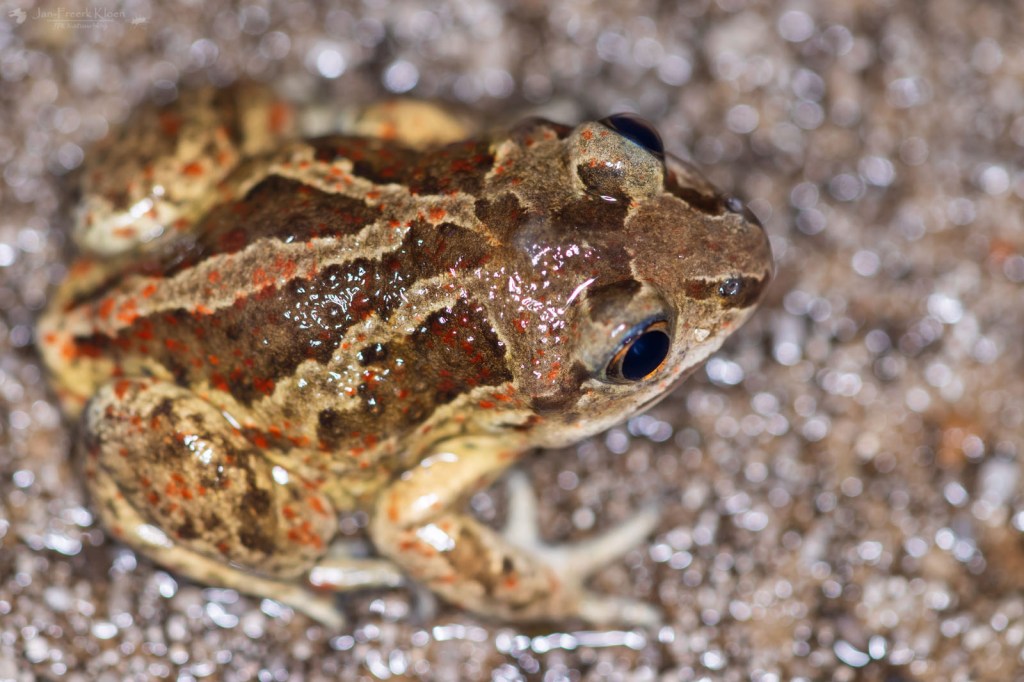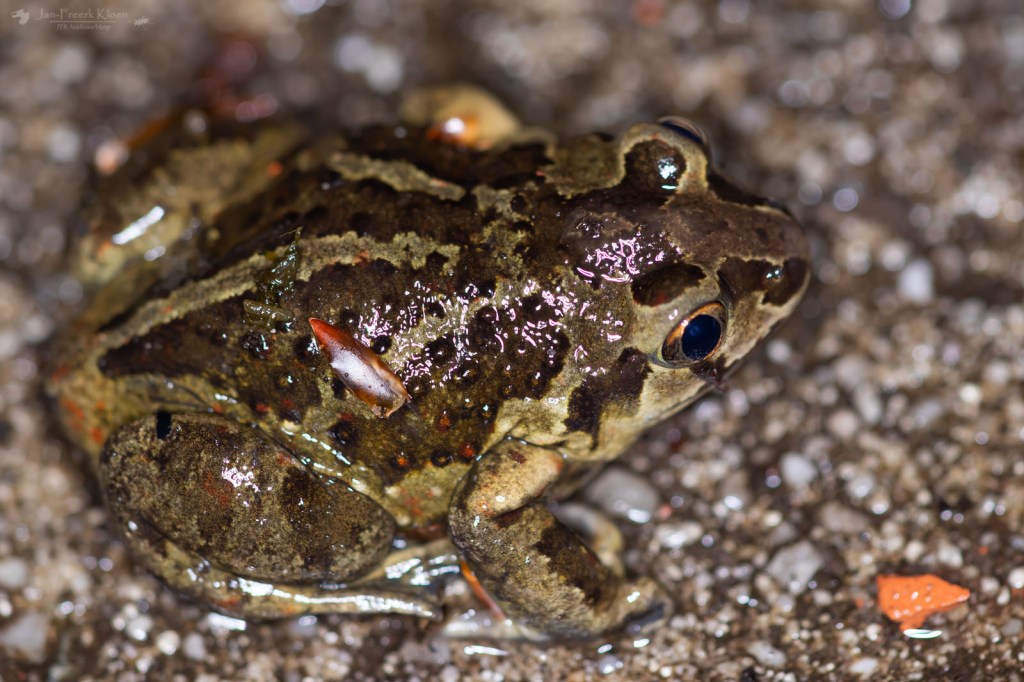 Ook met de knoflookpadden was het nog niet gedaan. We zagen een aantal mannetjes (te herkennen aan een lichte, dikke klier op de bovenkant van de voorpoten) en één vrouwtje dat duidelijk propvol met kikkerdril zat. Omdat de dieren zo op de harde, kale ondergrond niet echt een kant op konden wachtten de meeste lijdzaam af tot ik klaar was met foto’s maken waarna ze hun weg konden vervolgen.
