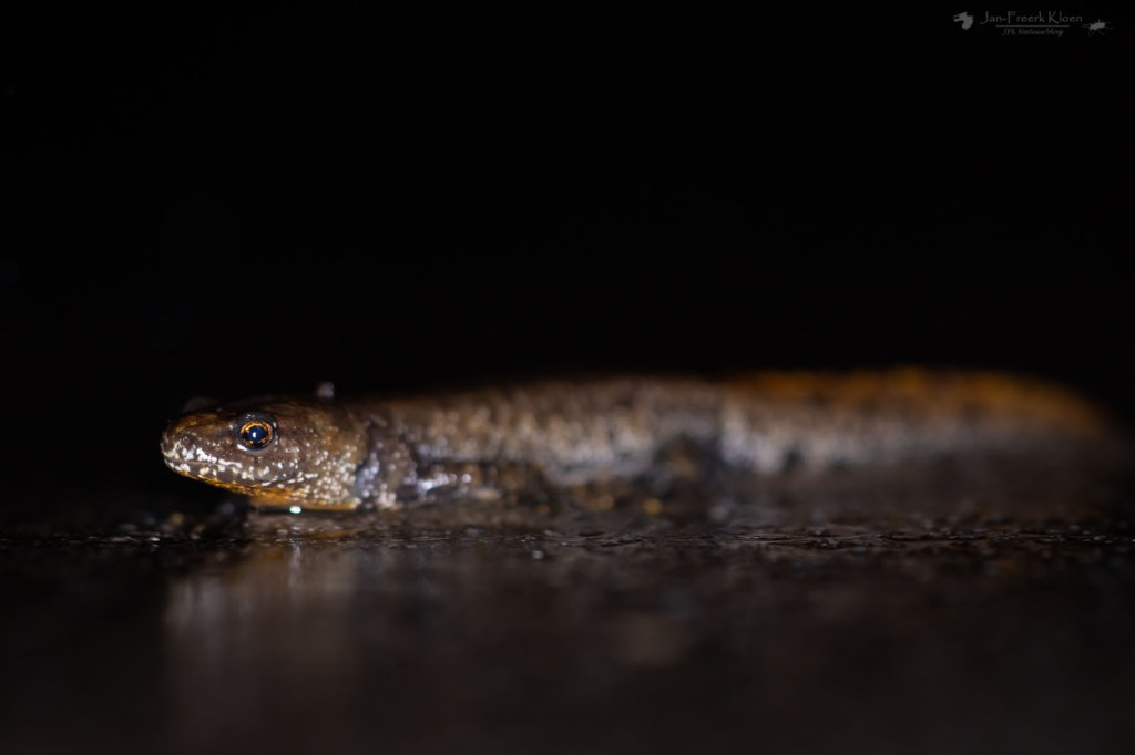 Maar het was nog niet gedaan met de leuke soorten. Want terwijl ik helemaal gefocust was op kikkers en padden liep er ook ineens een kamsalamander de weg over. Ik wist niet dat deze hier zat, maar hij was er toch opeens. Terwijl een deel van de knopjes van mijn camera uitviel door de regen kon ik deze ook op de foto krijgen. Dat kostte nog wel moeite, want door het warme en natte weer had het beest het tempo er flink in zitten.