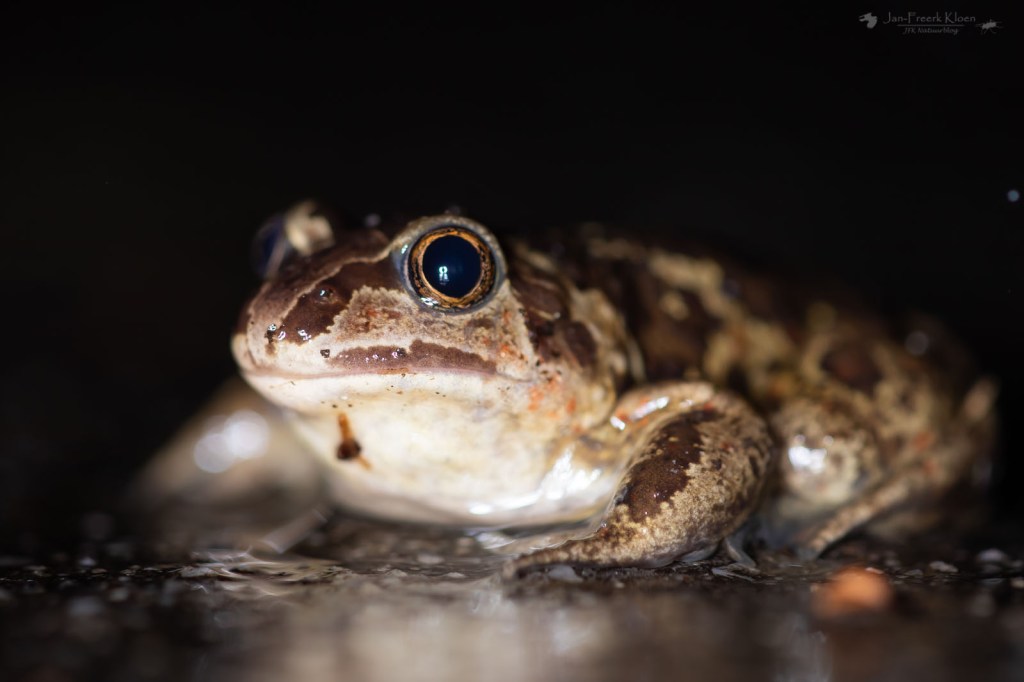 Gelukkig heb ik een familie met zo nu en dan een traditie en één daarvan is notenschieten in Drenthe. En zo kwam het dat ik met Pasen in Drenthe verzeild geraakt was, vlak bij een gebied waar knoflookpadden voorkomen. In dit gebied loopt een (’s nachts voor verkeer afgesloten) weg, waar de knoflookpadden bij gunstige omstandigheden overheen trekken.