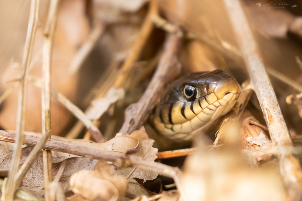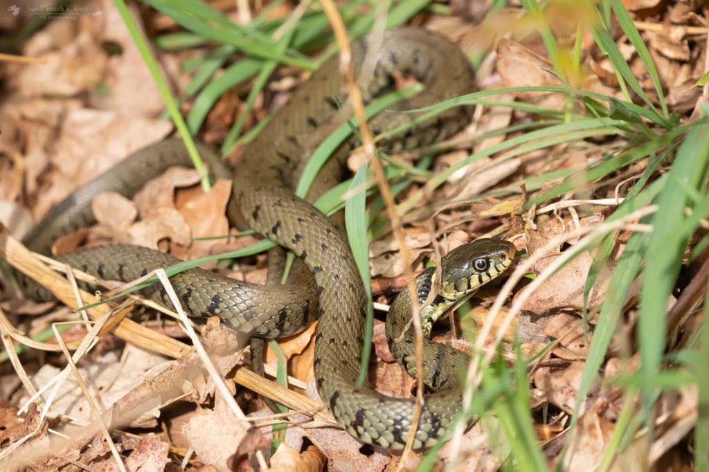Nadat de truien uitgegaan waren en ik een praatje hield over het gebied konden we meteen los. En al binnen een meter of 50 van de fiets zag ik de eerste twee ringslangen al liggen. Dat was wel een erg goed begin. De meeste mensen konden deze al prima zien, maar door de takken, blaadjes en mensenhoofden was het voor de achterste mensen toch lastig. Gelukkig kwamen er nog genoeg kansen. Nadat we ook de eerste hazelwormen van de dag telden vond ik nog een paar slangen bij elkaar, waarvan twee zich heel mooi lieten zien. Vol goede moed zochten we verder.