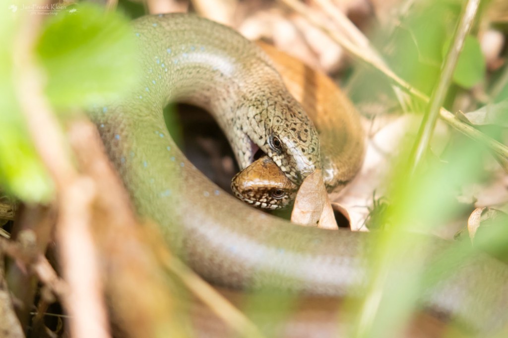 Intussen was ook één van mijn medetellers aangesloten om te helpen zoeken. De mooiste waarneming werd vervolgens door ons beiden over het hoofd gezien, maar gelukkig liepen er nog een stuk of wat studenten achter ons aan en zij letten ook goed op. Dicht langs het pad lagen twee hazelwormen in elkaar verstrengeld. Het mannetje, met subtiele blauwe vlekjes in de paartijd, hield het vrouwtje in de bek vast om te voorkomen dat zij er vandoor zou gaan tijdens ‘de daad’. En wij met zijn allen kijken. Natuurlijk! Zelf had ik pas één of twee keer parende hazelwormen gezien, en steeds in het hoge gras of tussen de struikjes. Deze twee waren prachtig voor de hele groep te zien! Gelukkig lieten zij zich niet verstoren door de aandacht.