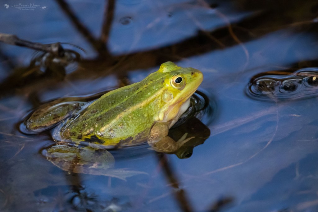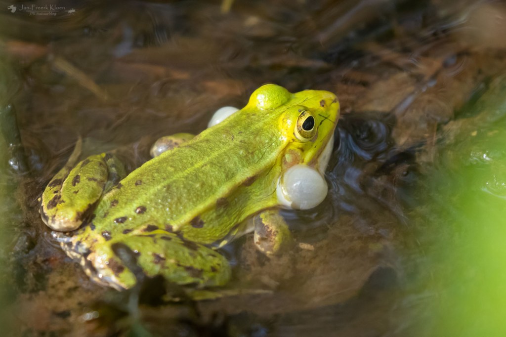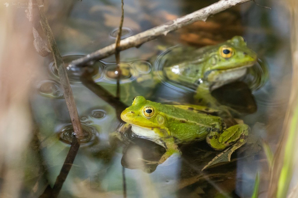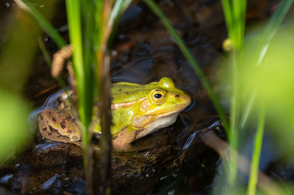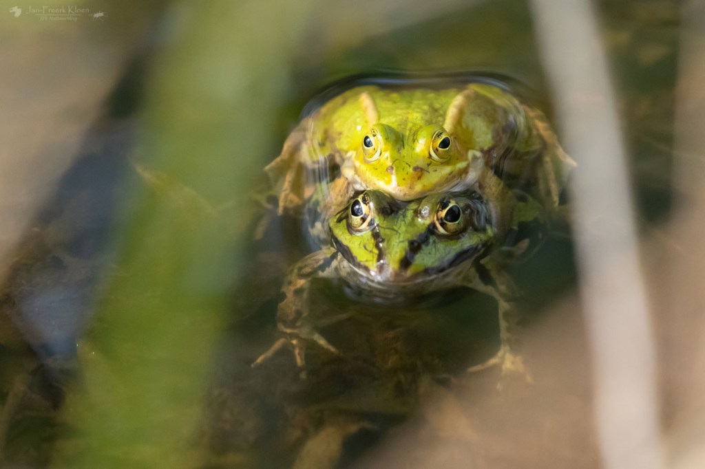’s Middags deed ik ook nog een grappige waarneming. In Kwintelooyen (bij Veenendaal) zag ik enorme aantallen groene kikkers midden in het bos. Veel beesten onder de krassen en sommige met lekke kwaakblazen, omdat het water van de vennen extreem hoog staat tot in het braamstruweel. En met zó veel hitsige kikkers op elkaar tussen de stekels gebeuren er nogal wat ongelukjes. De groep bestond waarschijnlijk uit zowel poelkikkers als bastaardkikkers, maar omdat de bastaardkikkers (op het oog niet of nauwelijks te onderscheiden) veel fanatieker riepen werd het poelkikkergeluid overstemd en daarop kun je het beste het onderscheid maken. Maar de helderwitte, ongevlekte buiken, lichte irissen en geelgroene kleine groene kikkers doen vermoeden dat er ook poelkikkers tussen zaten.