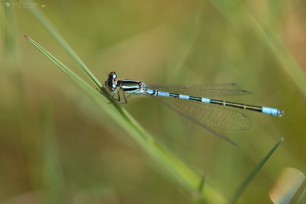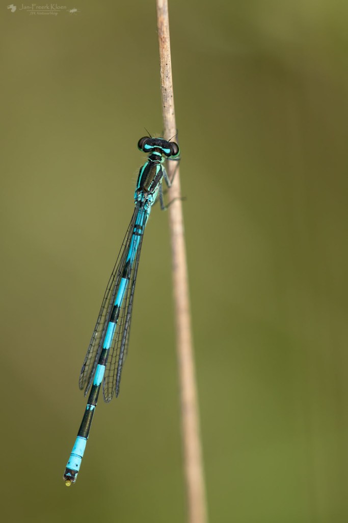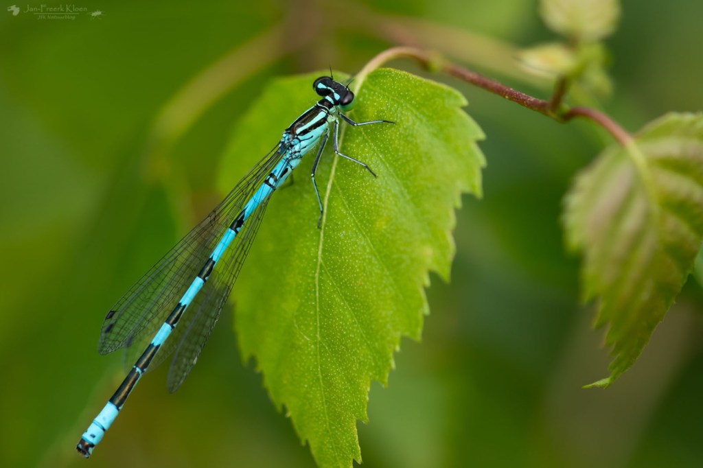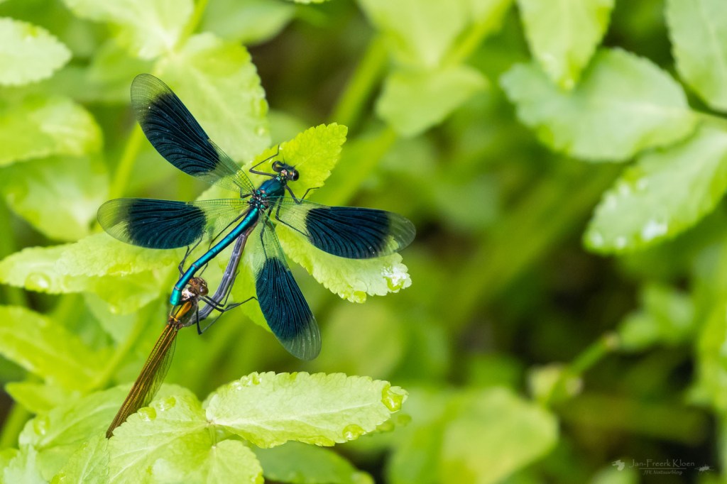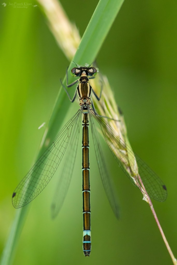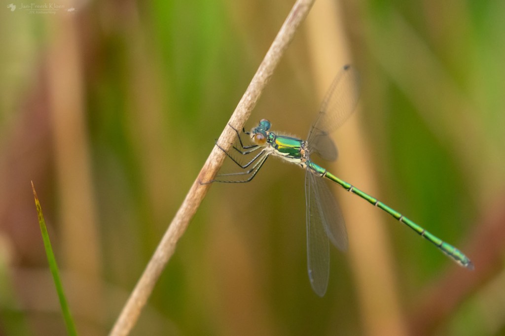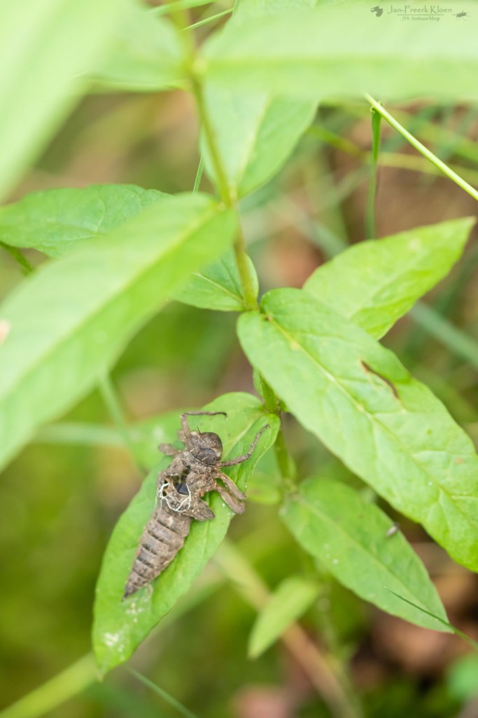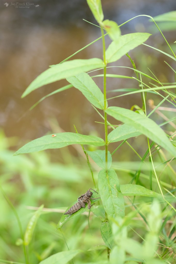 Aan het eind van de dag wilden we nog een poging doen om maanwaterjuffers te zien. Toen we net uit de auto wilden stappen zagen we alleen een flinke donderwolk hangen en een blik op Buienalarm voorspelde weinig goeds. Toen na een half uur in de auto wachten de bui eigenlijk gewoon uitbleef besloten we toch gewoon te gaan zoeken en in het zwaar bewolkte weer en de eerste druppels regen werden we niet alleen volledig lekgestoken door de muggen, maar vonden we ook drie maanwaterjuffers. Helaas lieten ze zich niet uitgebreid fotograferen, maar we hebben ze goed gezien.