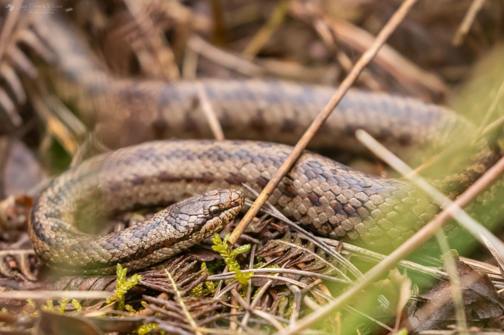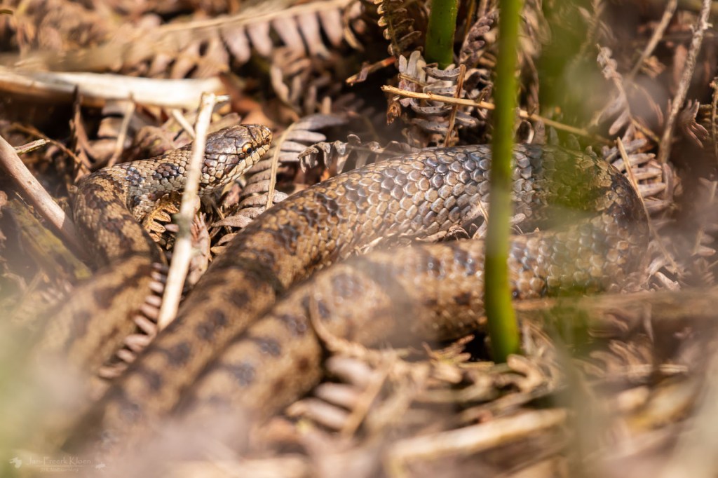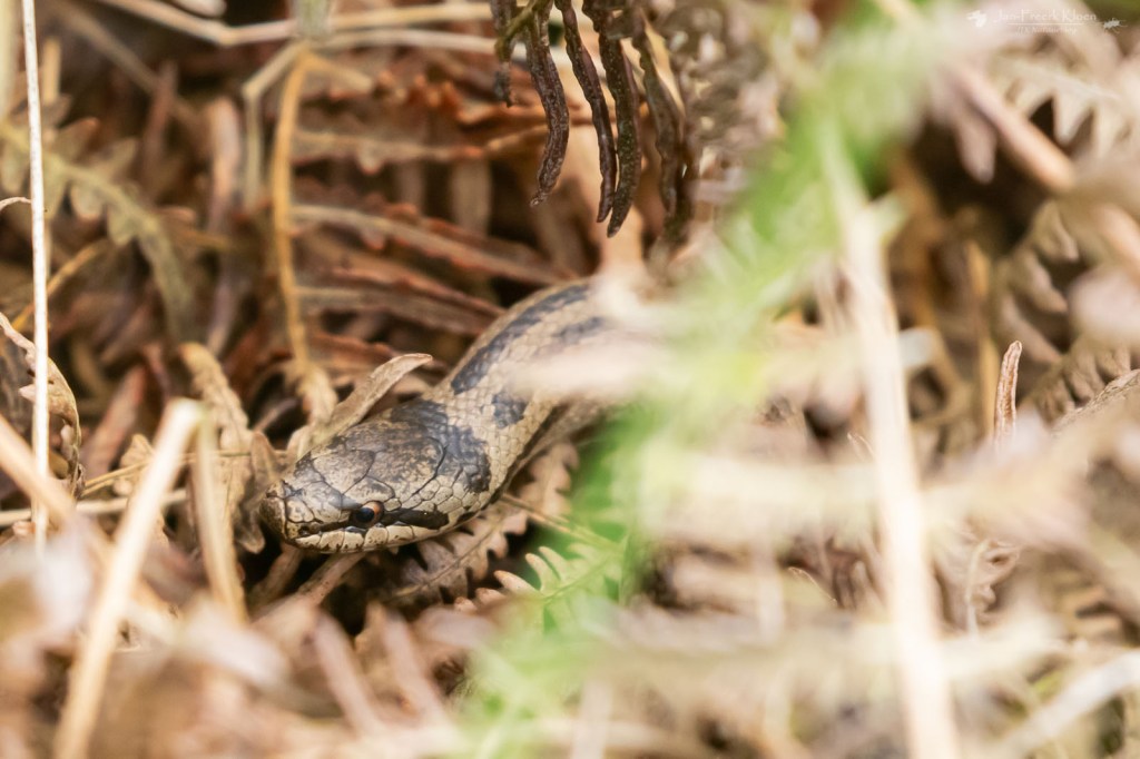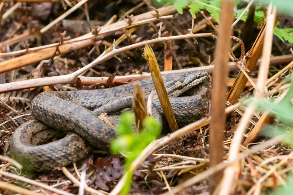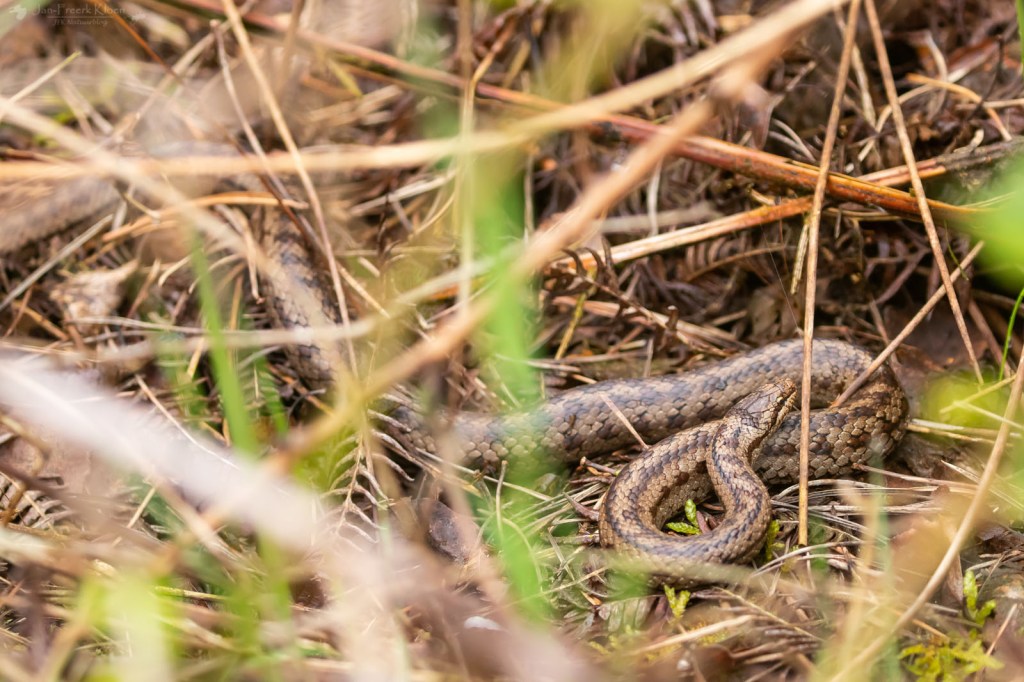 De dag begon zwaar bewolkt en de vegetatie was nog nat van de regen van vannacht. We wilden graag gladde slangen vinden en die houden niet zo van volle zon en wel van vochtig weer, maar dit was een beetje veel van het goede. Gelukkig vonden we na een tijd zoeken toch een gladde slang en toen de zon net wat doorbrak ging het hard. We vonden nog eens zes gladde slangen (voor mij een nieuw record op één dag) en de vlinders en libellen werden ook actiever. Er waren vele tientallen verse tangpantserjuffers in de oever langs een ven en in het braamstruweel kwamen we af en toe een bont dikkopje tegen.