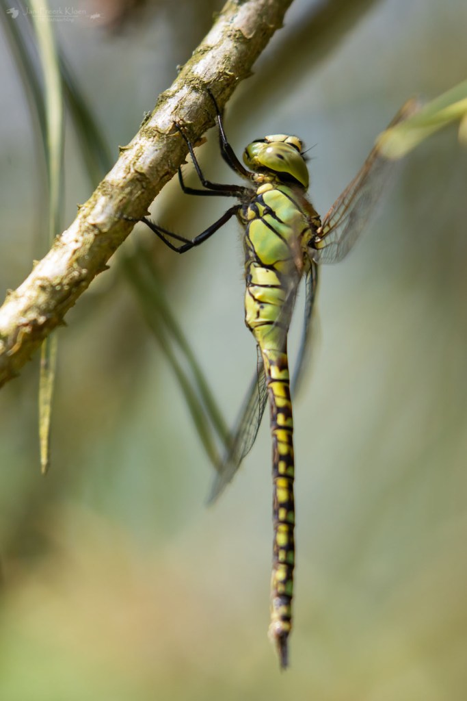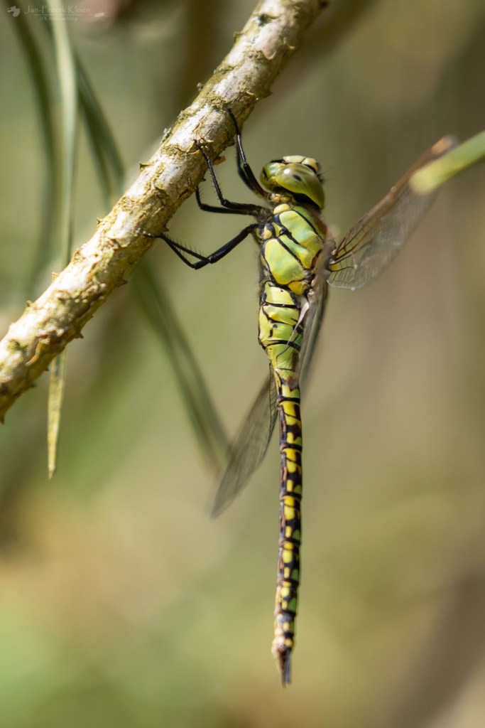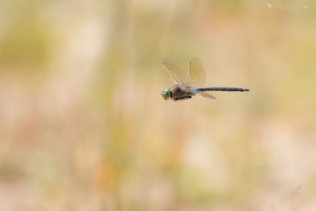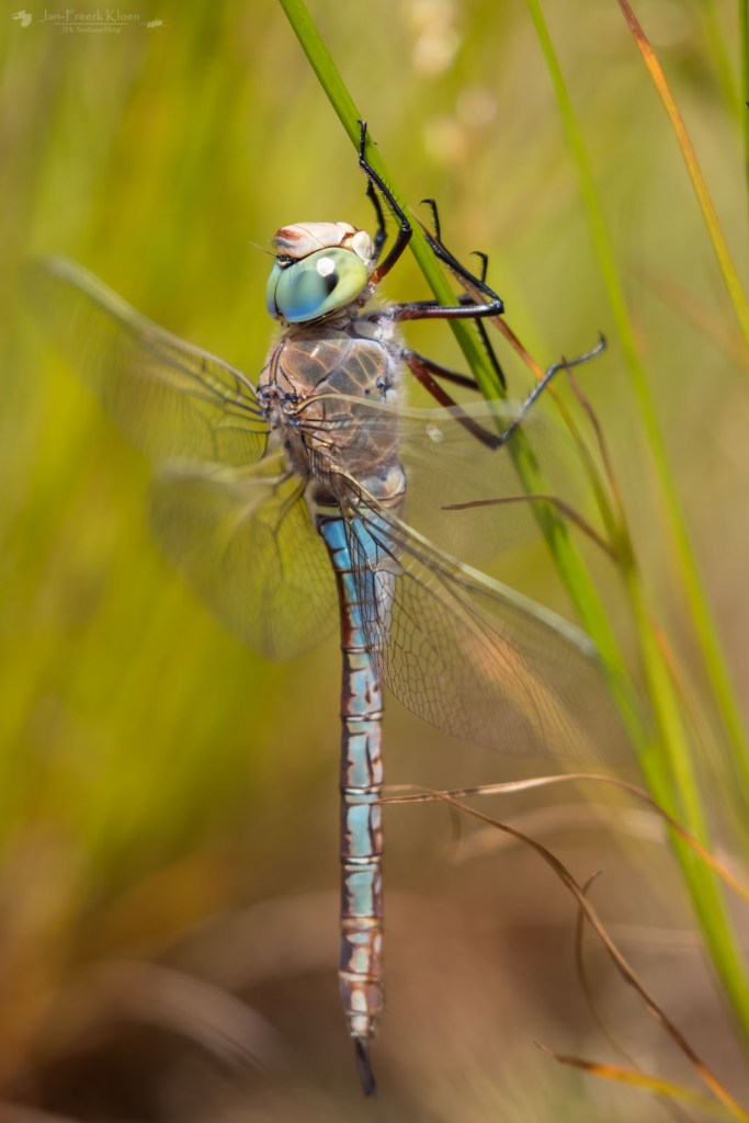 Ook tengere grasjuffer en tangpantserjuffers hadden het plekje weten te vinden. Na wat afleiding van een overvliegende grote weerschijnvlinder, een echte zeldzaamheid in deze omgeving, vond ik foeragerend boven het veld een paar zuidelijke keizerlibellen en een eerste steenrode heidelibel van het jaar. Een vrouwtje zuidelijke keizerlibel zag ik zomaar in het gras zitten en voor het eerst heb ik nu ook het vrouwtje van deze soort mooi op de foto.