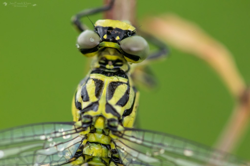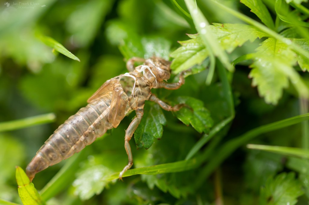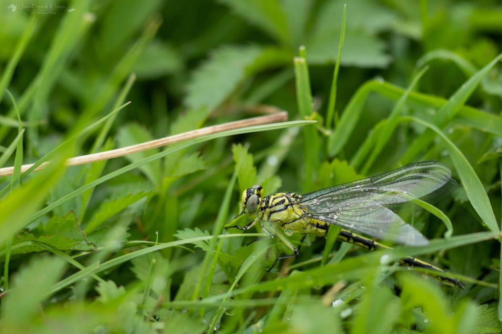 Na een buiige zaterdagochtend ben ik in Deventer langs de IJssel gaan zoeken. Het water stond een halve meter hoger dan de dag ervoor, dus oude larvenhuidjes waren weggespoeld. Die zou ik niet meer vinden. En een regenachtige ochtend is nou niet bepaald het beste moment om uit te sluipen. Toch vond ik binnen vijf minuten al een larvenhuidje. Pas nadat ik het larvenhuidje goed bekeken had, zag ik tot mijn stomme verbazing dat de libel die erbij hoorde een kleine 20 cm ervandaan in het gras op mij zat te wachten. Die had ik eerst niet eens gezien. Ze was al aardig op kleur en de vleugels waren opgepompt. Maar het regende wel weer.