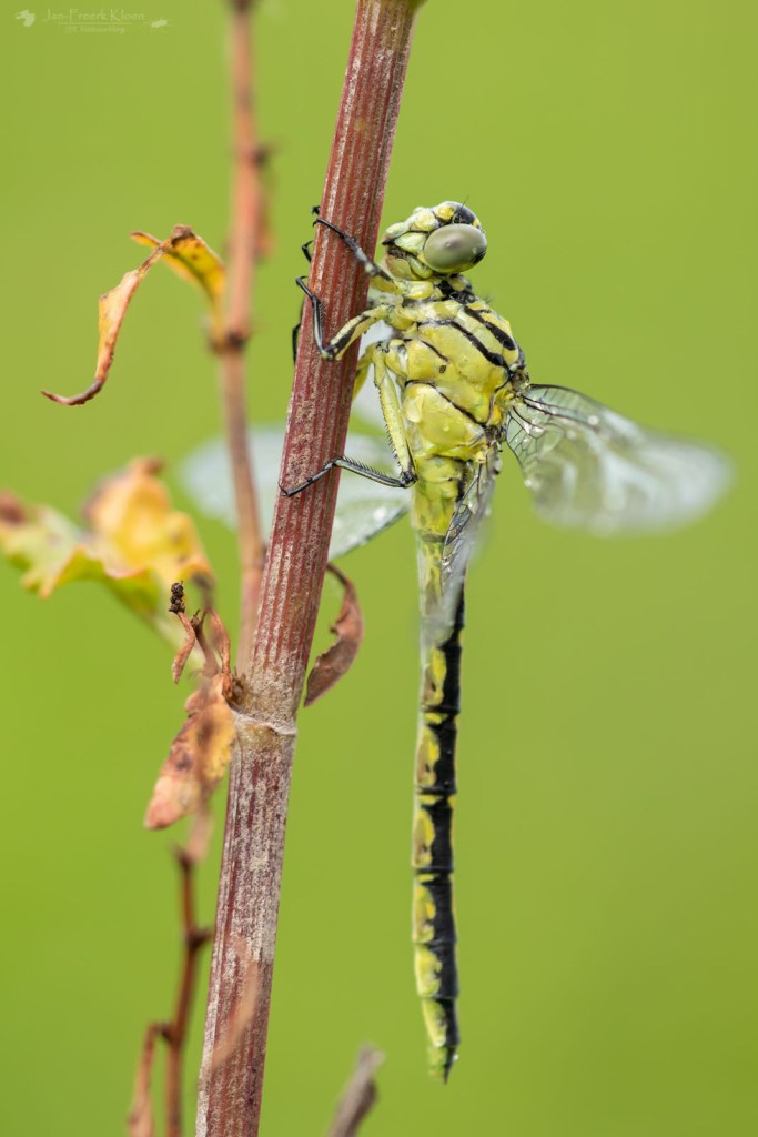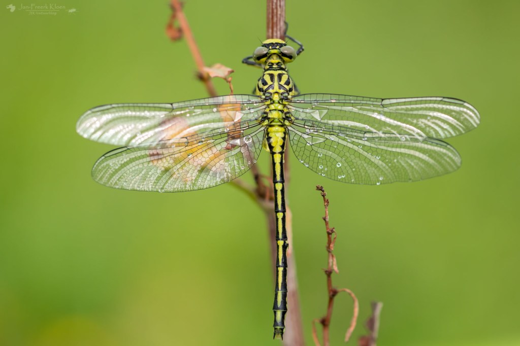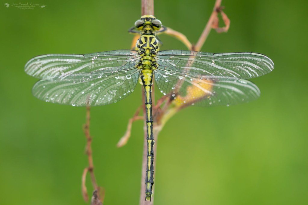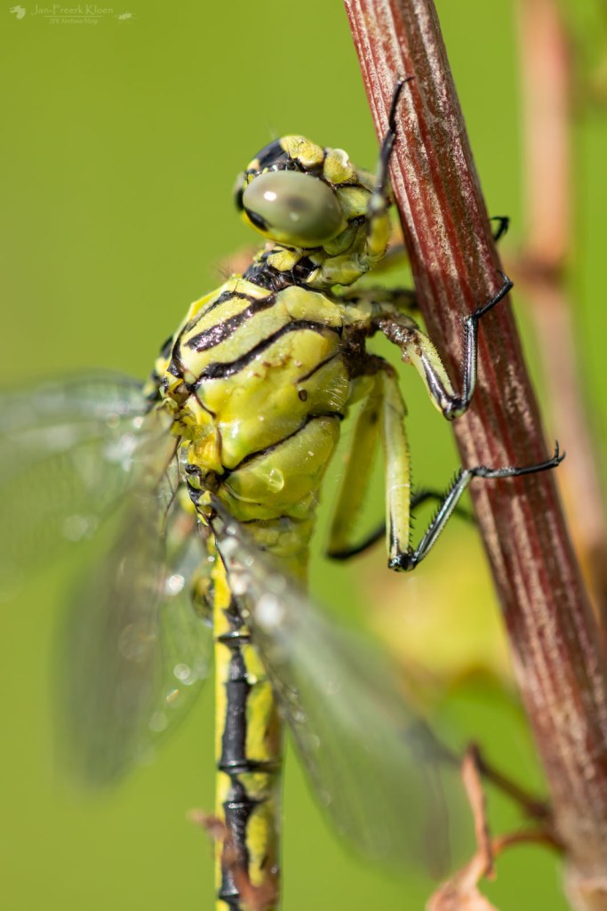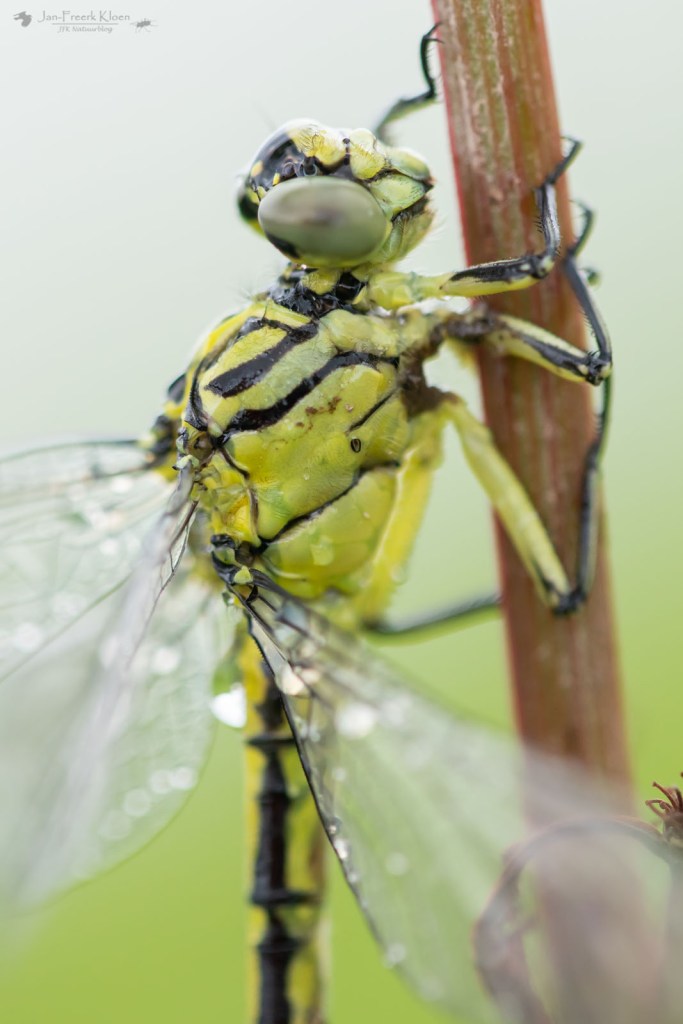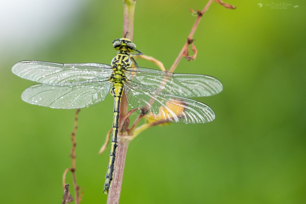 Ik hielp het beestje even naar een iets hogere spriet, waar ik haar makkelijker kon fotograferen. Op deze frisse en natte ochtend was ze nog niet in staat om te vliegen. Na een fotoshoot in de regen brak voorzichtig even het zonnetje door. De rivierrombout droogde iets op, en nog een paar foto’s later vloog ze een klein stukje om verderop in de ruigte weer neer te ploffen. Daar heb ik haar lekker gelaten.