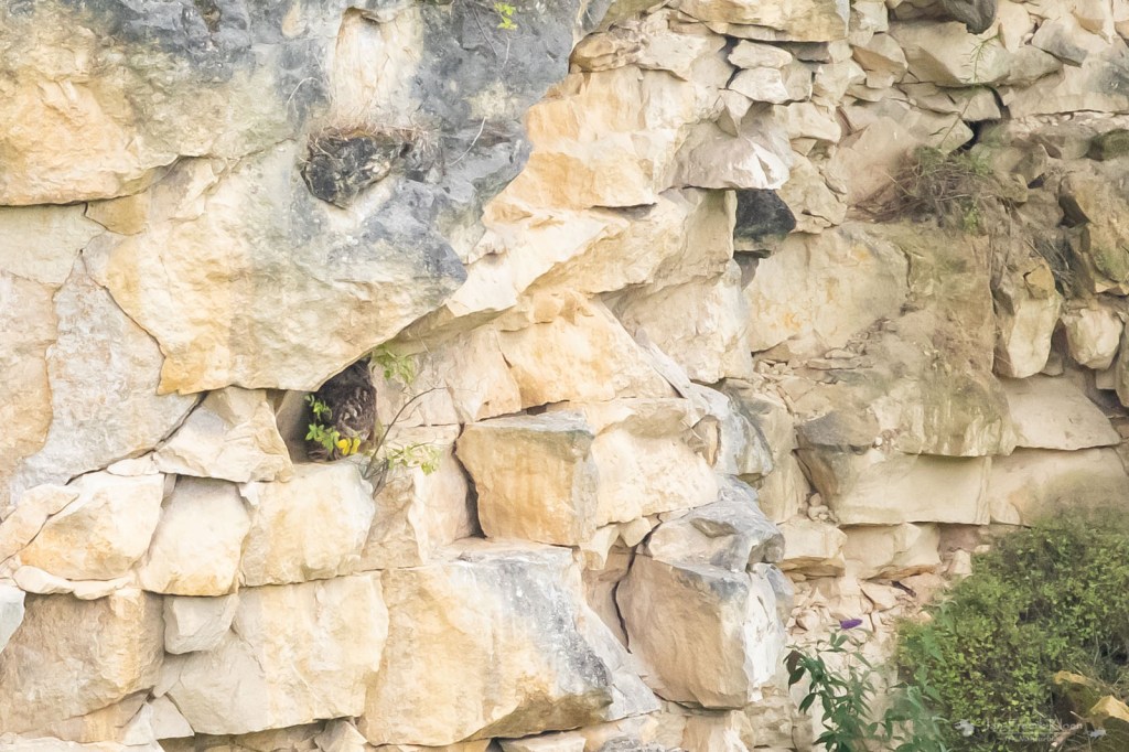 Doordat Ilse en ik allebei de planten in het gebied eerder al zo’n beetje gezien hadden konden we bij gebrek aan vlinders vlot doorlopen. We liepen het rondje om de groeve heen. Bij het uitzichtpunt over de groeve konden we eerst geen oehoe vinden, maar door goed speuren op de rotswand zag ik er na een tijdje toch eentje een beetje in een hoekje zitten. Lekker aan het dutten.