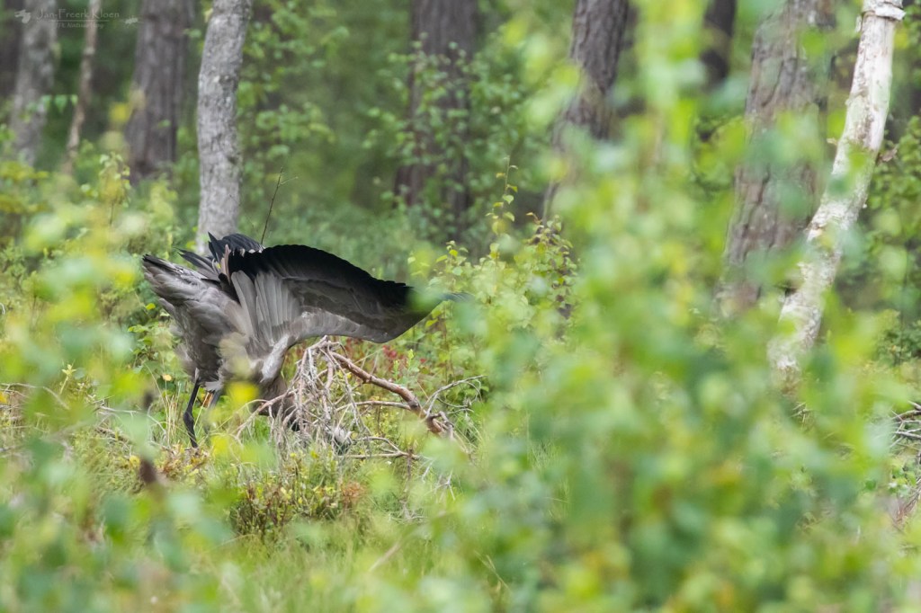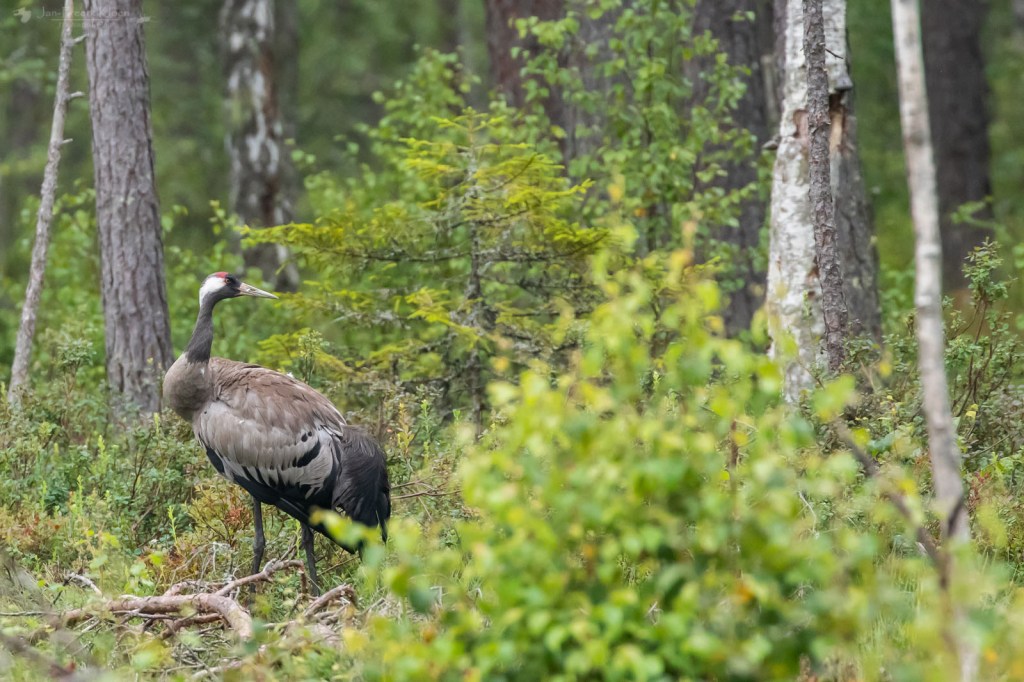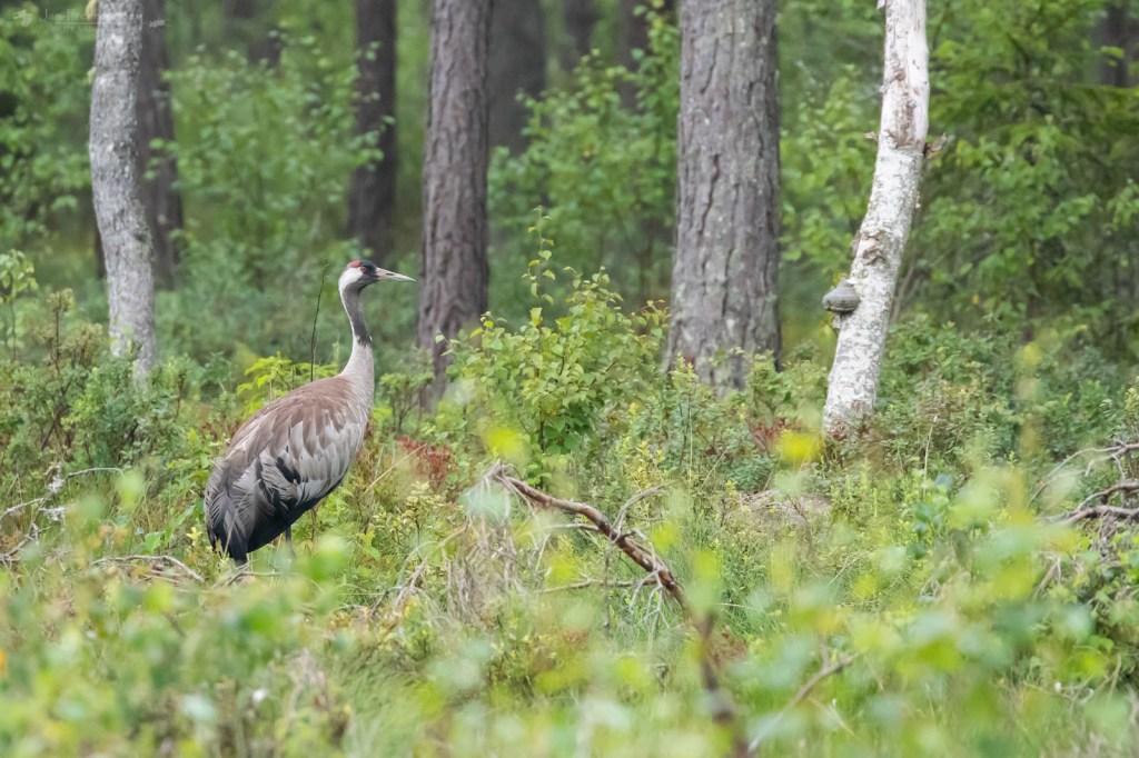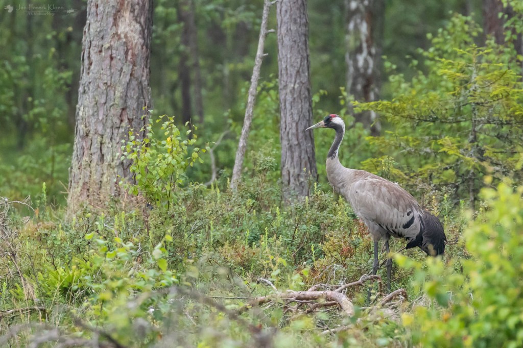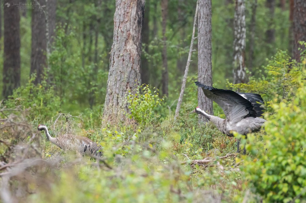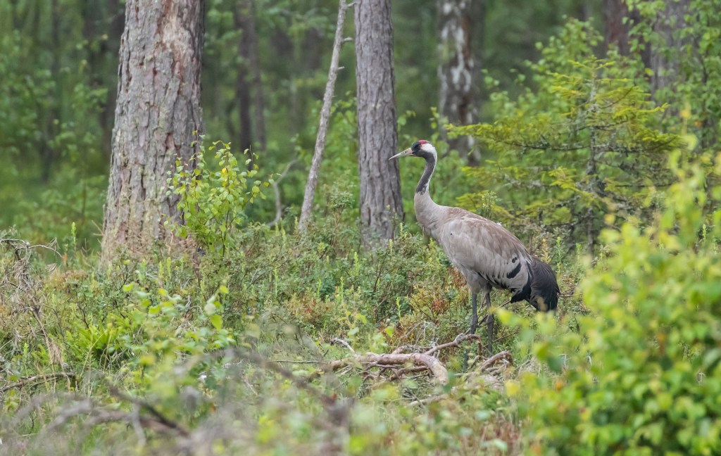 Door het prachtige Zweedse landschap fietsten we er over kleine, golvende weggetjes heen. Mooi loofbos, afgewisseld door weilandjes, stukjes natuur en boerderijen. Toen we om een hoekje bij een grasland verschenen stonden er om het hoekje dichtbij de weg twee kraanvogels. Toen ik een stuk verderop mijn camera had uitgepakt en terugging waren ze een stuk verder naar achter gelopen. Maar toen had ik de camera wel paraat bij twee andere kraanvogels die even later op een open plek stonden. Die waren eerst wat schichtig om zich heen aan het kijken, maar toen bleek dat die dikke toeter geen gevaar vormde bleven ze gewoon staan en gingen ze door met wat poetsen en rek- en strekoefeningen.