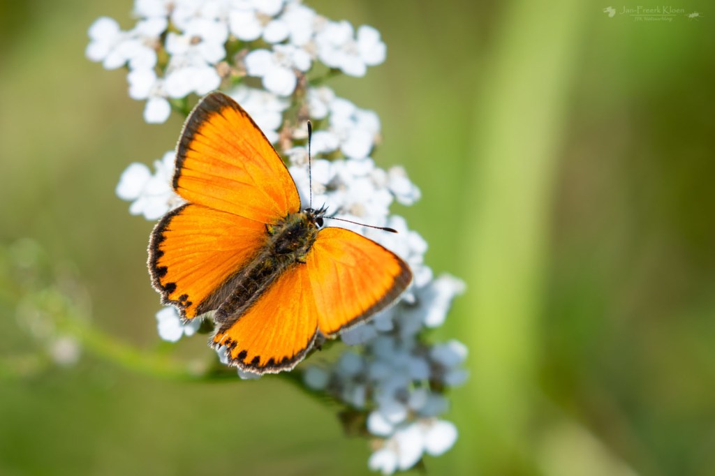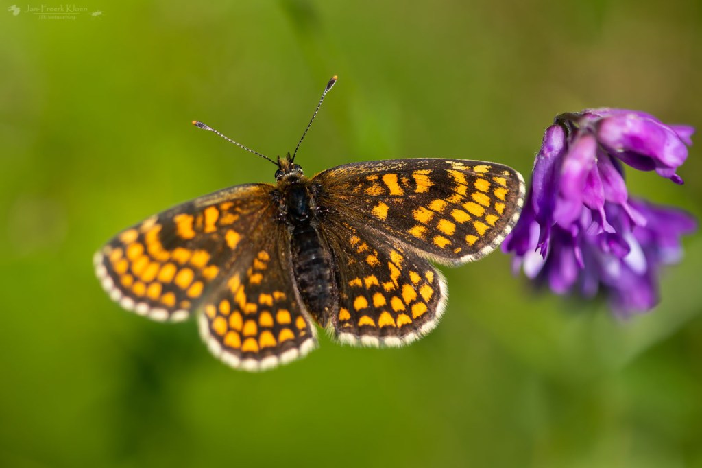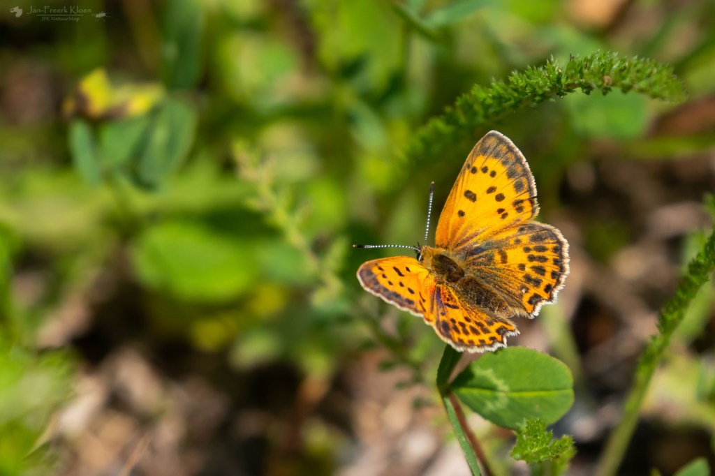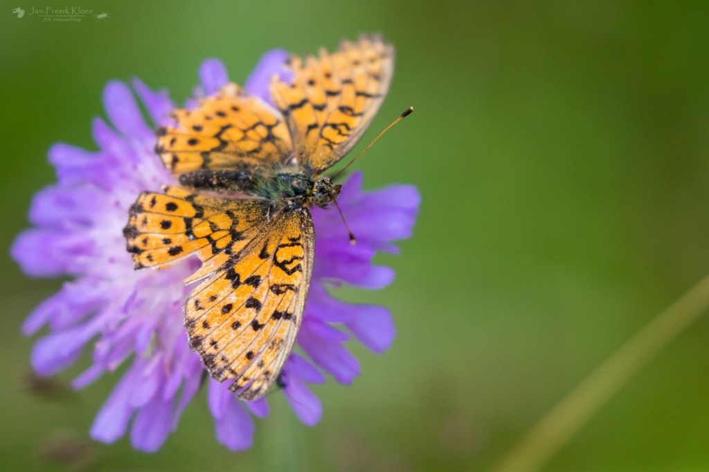 Het vlonderpad door het hoogveen begon in een bos vol blauwe bosbessen en rijsbessen. Op de Veluwe zouden alle bessen allang door de zwijnen zijn opgegeten, maar in Zweden is er meer dan genoeg. Een mooi gezicht. Het pad liep eerst door een stuk veen met nog veel grove dennen. Afgewisseld door een soort eilanden van stevige ondergrond waar bos voet aan de grond had gekregen. In het hoogveen zagen we met name veel heideblauwtjes en af en toe een purperstreepparelmoervlinder. Met goed zoeken zagen we ook de eerste echte hoogveenspecialist: het veenhooibeestje. Op de eilanden kwamen we opnieuw het morgenrood, grote parelmoervlinders, bosparelmoervlinders en nu ook een bosrandparelmoervlinder tegen.