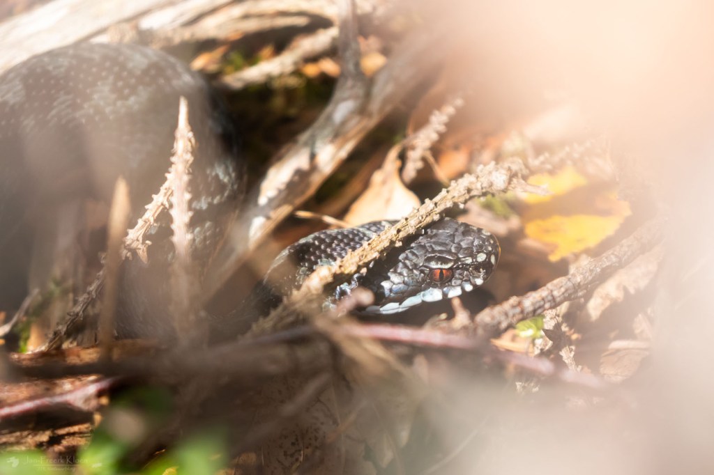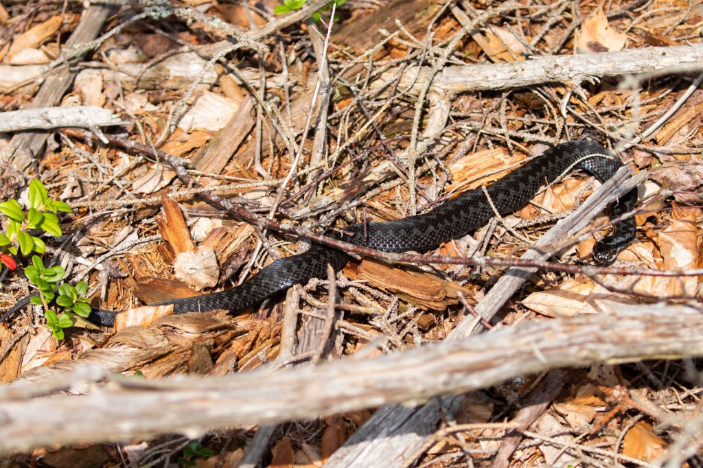 Hoewel het op en rond het vlonderpad stikte van de levendbarende hagedissen, zagen we ondanks het geschikte weer geen enkele adder. Dat veranderde op de terugweg, toen er opeens eentje in de bosrand het pad overstak. Even later ging het mooie, donker gekleurde beest mooi liggen zonnen. Uiteindelijk zagen we zelfs nog drie adders. Dat ging opeens hard.