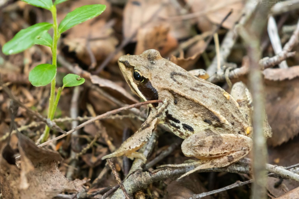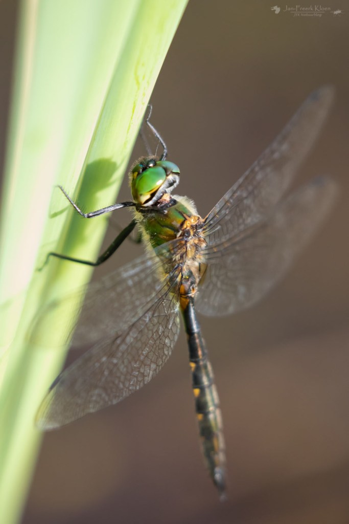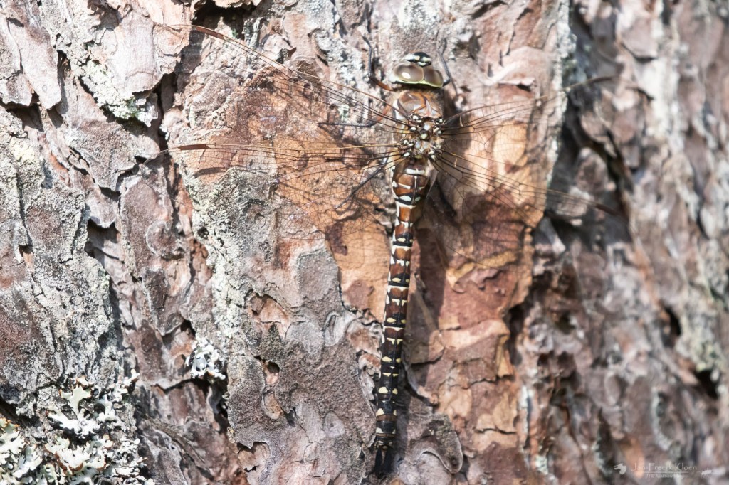 Beneden zag ik libellen langs het water vliegen. Met de verrekijker kon ik er net te weinig van zien, dus ik ging naar beneden en baande me een weg door het rietveen. Dat was makkelijker gezegd dan gedaan, maar ik kwam bij de waterkant. Of eigenlijk was ik denk ik al op het water. De ondergrond voelde als trilveen (een drijvende veenmat op het water). Bij het water viel de score toch wat tegen met wat algemene soorten als de grote roodoogjuffer, viervlek en metaalglanslibel. Maar op de weg terug door het riet zag ik wel heel mooi een gevlekte glanslibel vliegen en daarna landen. In Zuid-Zweden een heel algemene soort, maar als Nederlander ging mijn hart er toch wat sneller van kloppen.