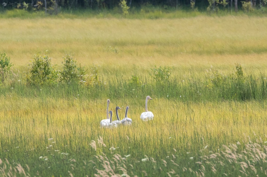 Tegen het eind van de middag wilde ik graag nog een tussenstop maken in een laagveengebied waar we toevallig langskwamen. Toen we zagen dat er aan de rand van het bos een uitkijktoren stond had ik niks anders meer nodig om Hendrike mee het gebied in te krijgen. Vanaf de toren hadden we prachtig uitzicht over het Barkerydssjön, zoals het Natura 2000-gebied heet. Qua vegetatie deed het me aan de Weerribben denken, maar dan onontgonnen en veel kleiner. We konden de overkant zien, het was ongeveer kilometer in doorsnee denk ik. In het midden liepen wilde zwanen met jongen.