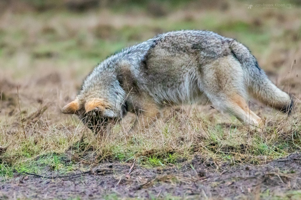 Veel tijd om te bekomen van deze plotselinge komst had ik niet. Het beest maakte een sprong en bleef met zijn snuit bij de grond. Kauwende bewegingen maakten duidelijk dat het beest een muis te pakken had. Een muis! Zo’n groot roofdier! Tja, een jong dier moet ergens zijn jachttechnieken op oefenen. En dan heb je ook meteen een smakelijke snack. Toen de muis op was liep hij verder het veld op. Hij dribbelde rustig langs de bosrand naar rechts, waarbij hij nogmaals op een muis dook. Langs de bosrand liep hij het hoekje om naar voren en toen hij aan de voorkant van het veld kwam nogmaals rechtsaf. Recht op het kijkscherm af.