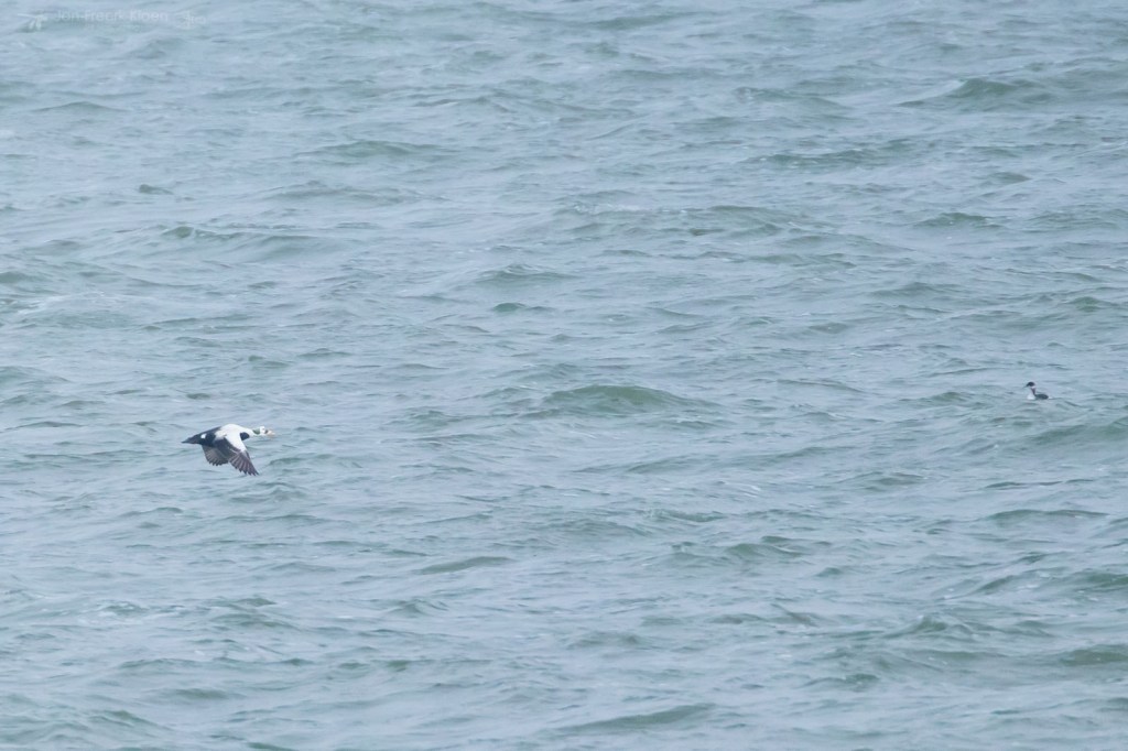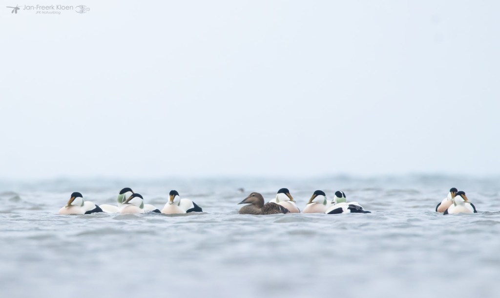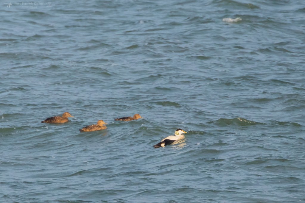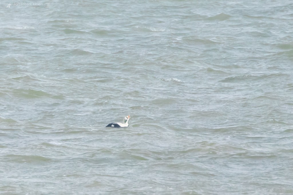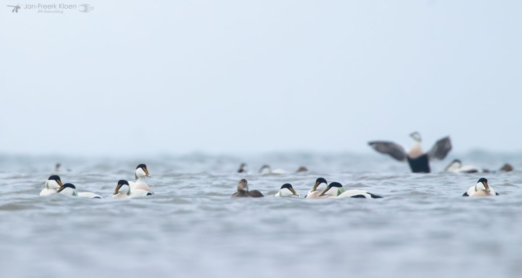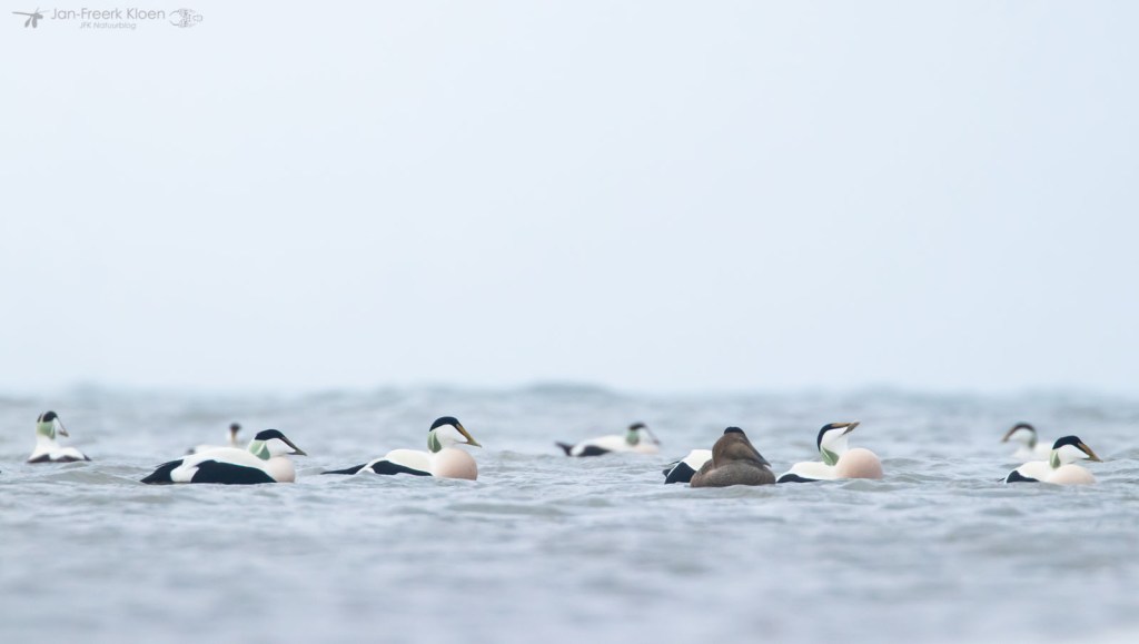Zelf genoot ik het meest van de eiders die voor de kust dobberden. Op zo’n dertig meter zat een behoorlijke groep met veel mannetjes en die waren flink met elkaar aan het donderjagen. Er werd volop gebaltst. Het geluid kon ik helaas niet horen door de wind die van ons af stond. Maar het was een heel imposant gezicht!
