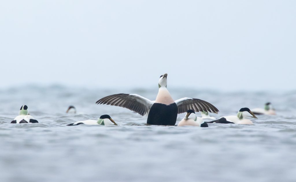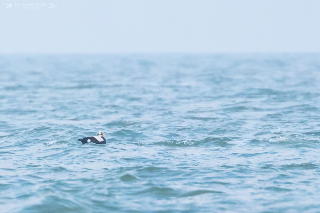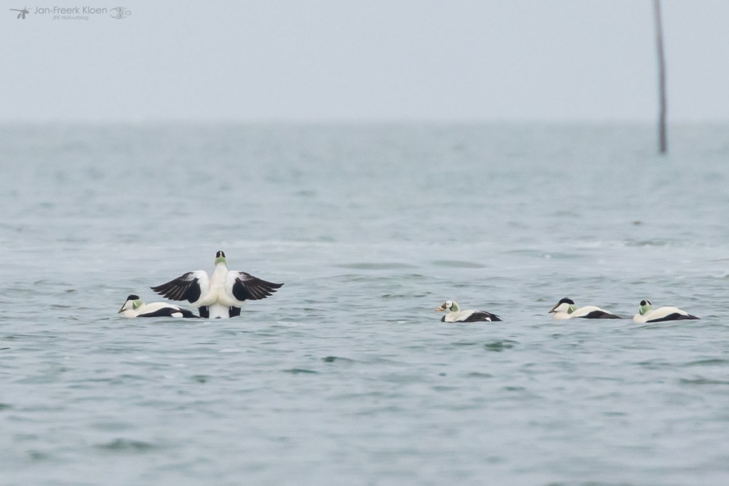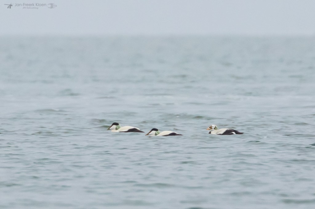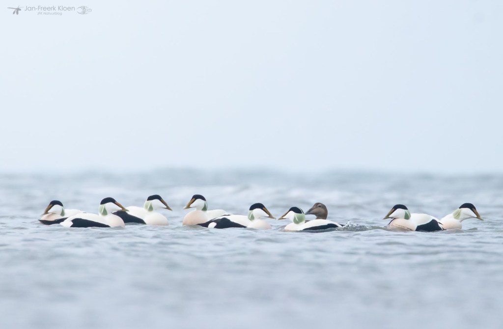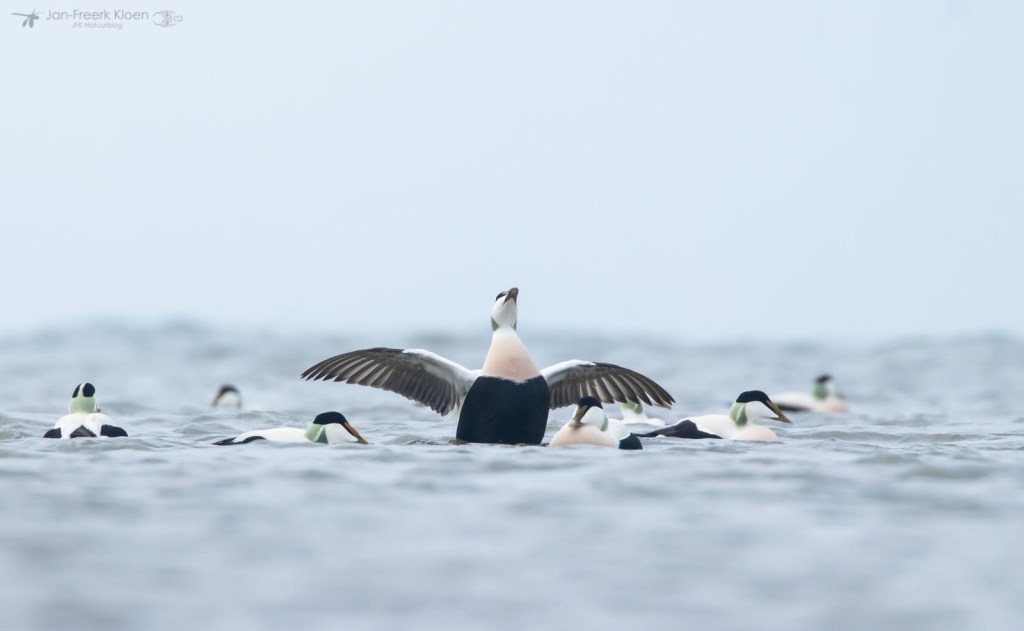 Zelf genoot ik het meest van de eiders die voor de kust dobberden. Op zo’n dertig meter zat een behoorlijke groep met veel mannetjes en die waren flink met elkaar aan het donderjagen. Er werd volop gebaltst. Het geluid kon ik helaas niet horen door de wind die van ons af stond. Maar het was een heel imposant gezicht!