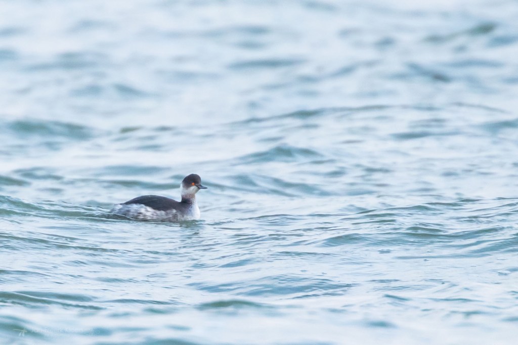 En nee, ik kon het niet laten. Na een tussenstop in hetzelfde cafeetje als vorige week in Oosterend (het beviel wel) sleepte ik Kylian en Hendrike mee naar de IJzeren Kaap om toch nog even naar de brileider te gaan kijken. Hij zwom best dichtbij, een stuk beter dan vorige week. Bovendien was het windstil en de Waddenzee was een rustige vlakte. Ondanks dat het nog steeds te ver weg was voor echte topfoto’s, was het wel de moeite waard. De brileider, eiders en een stuk of wat geoorde futen waren mooi te zien!