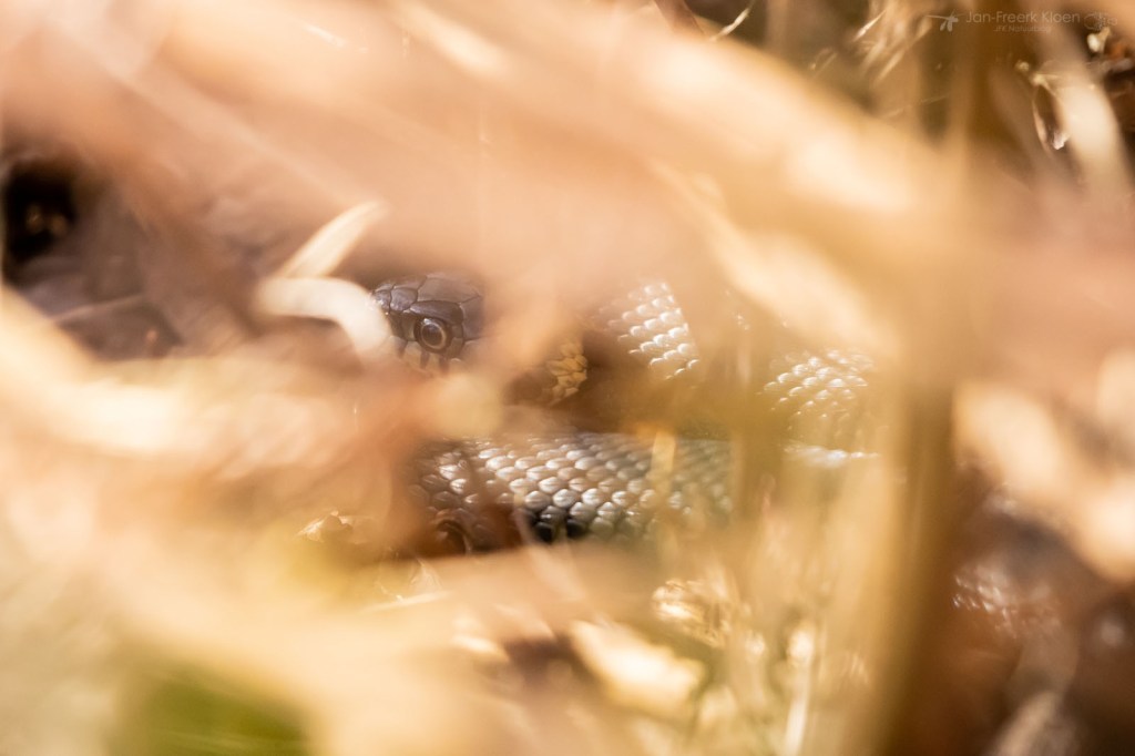 Wellicht was ik toch nog wat te vroeg op de dag, want op de terugweg had ik meer geluk. Vlakbij elkaar vond ik twee zonnende ringslangen. Ze waren nog erg traag. Even opstarten na een flinke winterrust.