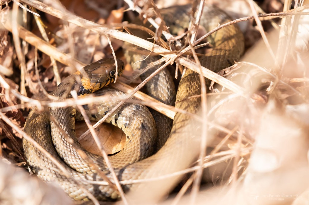Ringslangen zijn eigenlijk een soort schaatsers. Op de eerste mooie dag is er altijd wel een gek die denkt dat het al wel kan. En ja hoor, daar waren ze! Geef ze ook eens ongelijk met dit weer. En dan kan maart zijn staart nog gaan roeren en dan mag april doen wat ‘ie wil, maar voor mij is de lente begonnen!