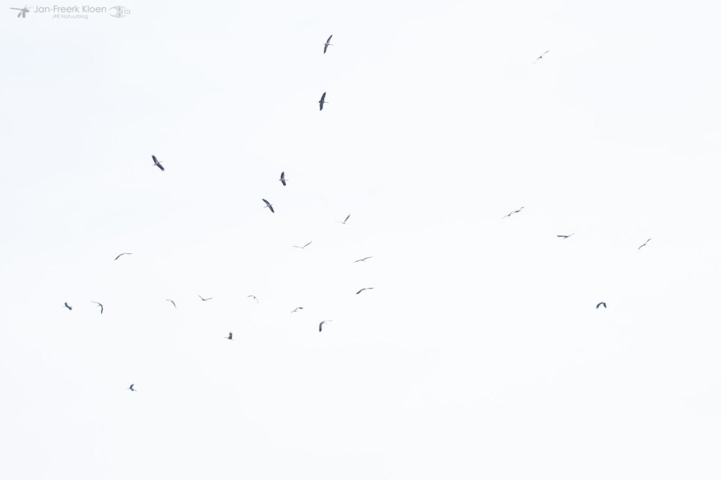 Even later kwam er nog een flinke groep grote vogels langs cirkelen. Automatisch dacht ik meteen aan kraanvogels, maar er klopte iets niet. Het ging allemaal iets te snel, kraanvogels vliegen doorgaans traag en statig. Dat klopt, ik had me laten foppen door een groep van 25 ooievaars. Ja, ook die trekken in het vroege voorjaar naar het noorden. Ik zie ze niet vaak in zulke grote groepen trekken, maar het kan dus wel.