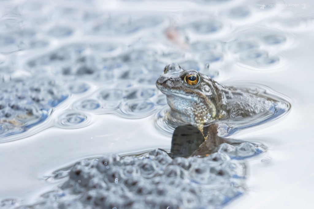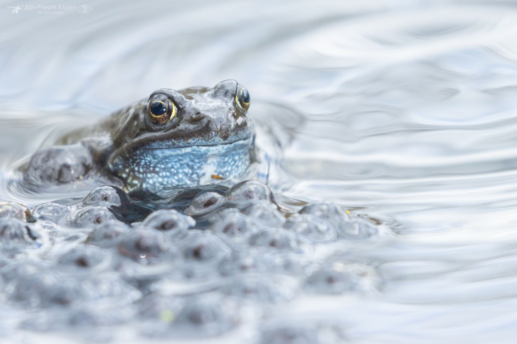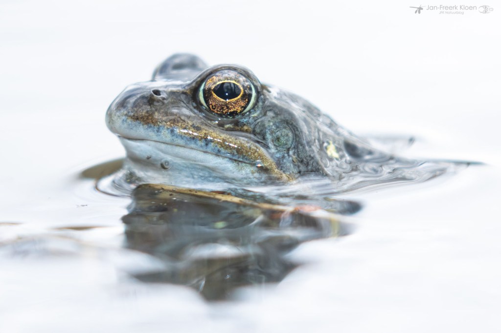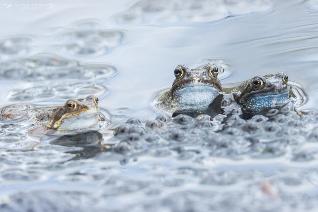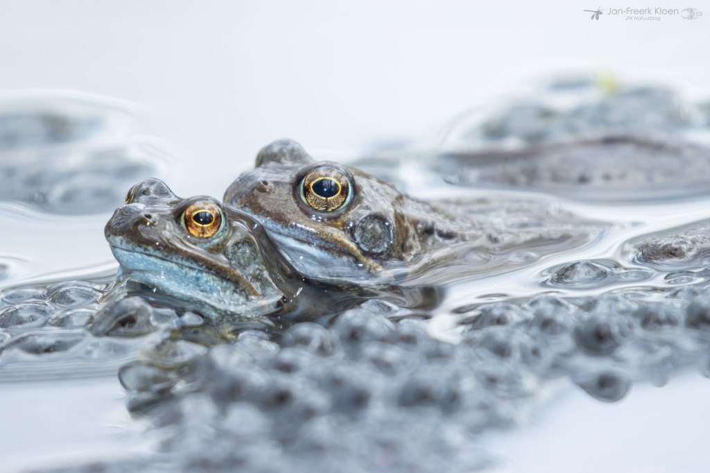 Ook bruine kikkers kunnen wat blauw aanlopen in de paartijd. Dan worden ze soms verward met heikikkers. Al knorrend liggen ze bovenop de al gelegde kikkerdril en dollen ze wat rond. Ze zijn veel minder schuw dan heikikkers, en daardoor kon ik ze leuk zien afgelopen weekend. Een saai bruin kikkertje kan dan opeens veel mooie details hebben.