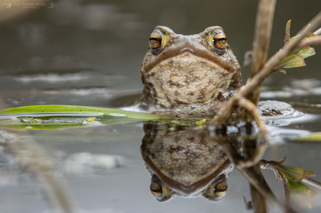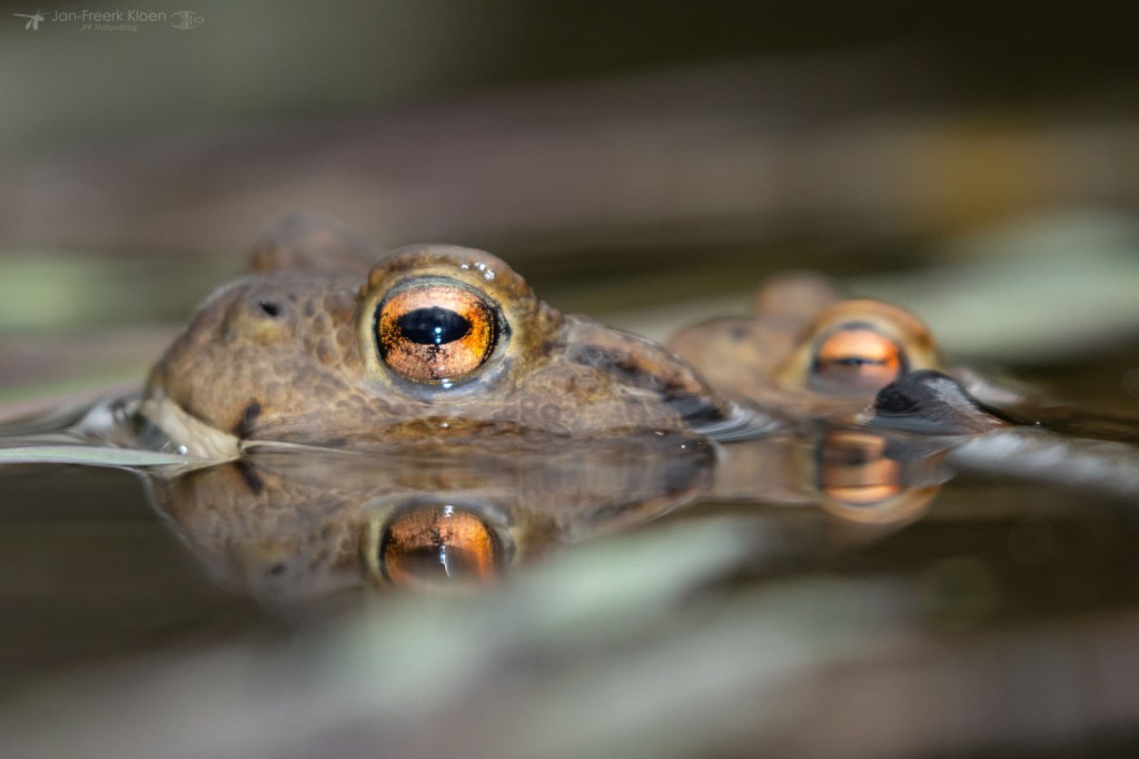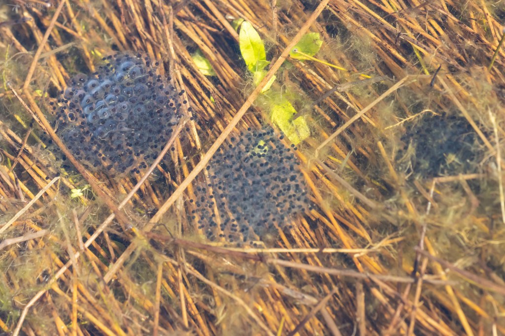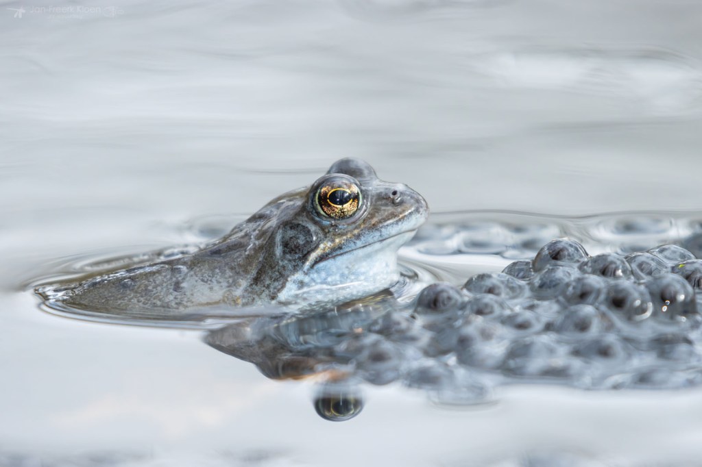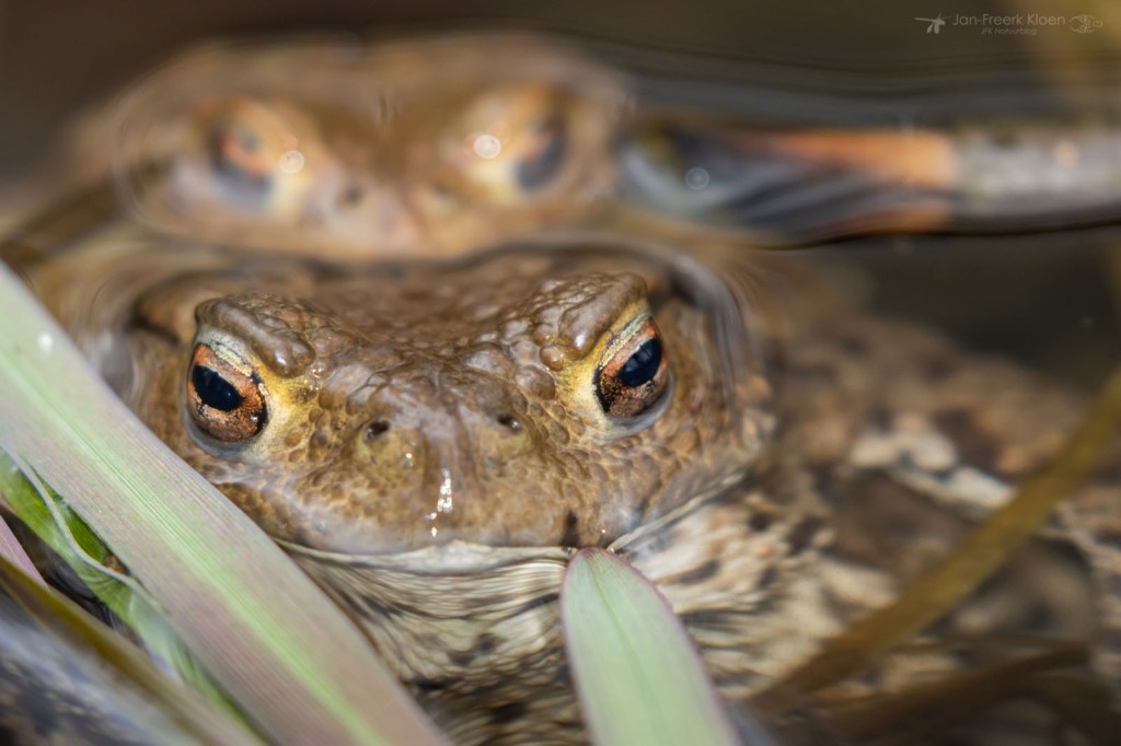 Ook bruine kikkers kunnen wat blauw aanlopen in de paartijd. Dan worden ze soms verward met heikikkers. Al knorrend liggen ze bovenop de al gelegde kikkerdril en dollen ze wat rond. Ze zijn veel minder schuw dan heikikkers, en daardoor kon ik ze leuk zien afgelopen weekend. Een saai bruin kikkertje kan dan opeens veel mooie details hebben.