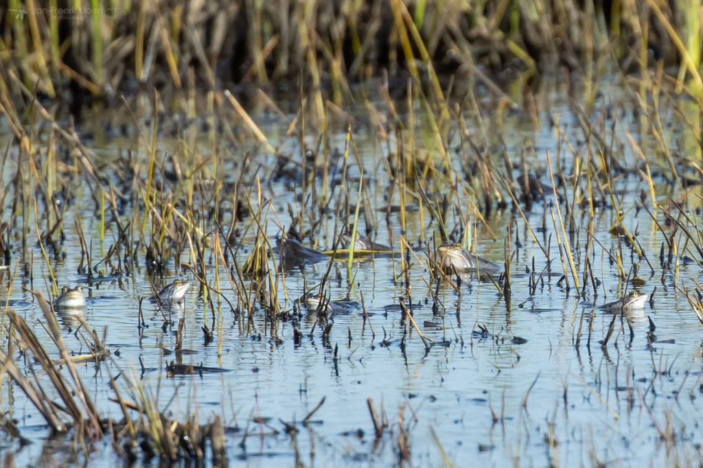 In de paartijd kleuren de mannetjes voor een paar dagen helderblauw. Een spectaculair verschijnsel, hoewel het waarnemen lastig is. Niet alleen is het heel moeilijk het perfecte moment te vinden, ook zijn heikikkers extreem schuw en de meeste duiken onder als je binnen twintig meter afstand komt. Daardoor is het moeilijk ze in vol ornaat van dichtbij te zien te krijgen. Vorig jaar in het Kootwijkerveen lukte het me. Dit jaar deed ik een poging in het Binnenveld, waar ik vorig jaar de soort nieuw voor het gebied ontdekte. Toen hoorde ik één individu en vond ik in de zomer een boel juveniele heikikkertjes. Des te nieuwsgieriger was ik dit jaar naar de voortplantingstijd, nu ik beter wist ik waar ik moest zoeken. En ze waren er. In het gebied is weinig permanent water, maar aan het eind van de winter zijn er genoeg laagtes in het blauwgrasland volgelopen. Daar zaten nu op zes verschillende plekken mannetjes te roepen. Overtuigend blauw waren ze niet, daarvoor was de timing niet goed genoeg. Maar ik was toch blij met mijn waarneming.