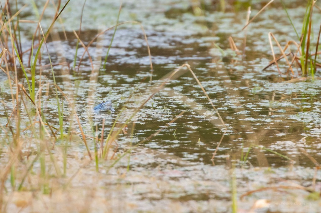 Twee dagen later in Drenthe was de timing beter. In een klein veentje bij Anloo kwamen er een hoop ploppende geluiden uit het ven. Met de verrekijker konden we de knalblauwe heikikkers mooi zien.
