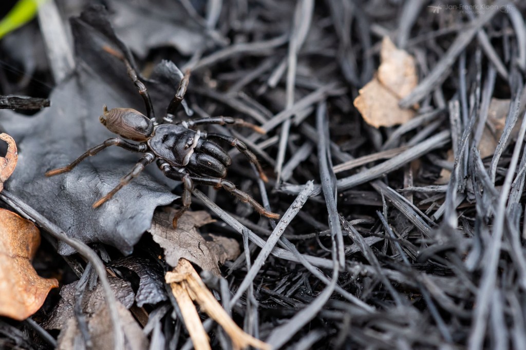 Tussen de sprieten is veel insectenleven te vinden. Met name veel mieren lopen over de grond. Rode bosmieren, maar ook allerlei andere soorten. Nieuwe routes worden uitgezet en ‘rommel’ wordt opgeruimd. Tussen de mieren zag ik ook een mooie grote spin lopen: de gewone mijnspin. Een echte Veluwse soort van droge heidegebieden. Ik ken ze als de grote spin die opvalt als hij over zandpaden en fietspaden loopt. Op de zwartgeblakerde grond is hij perfect gecamoufleerd.