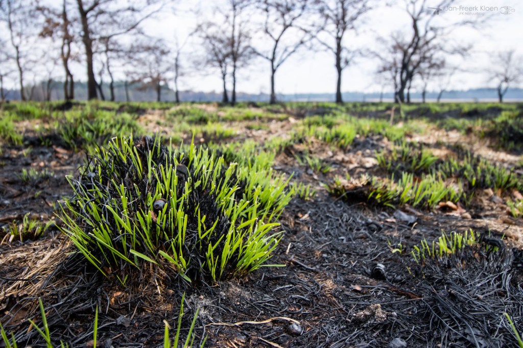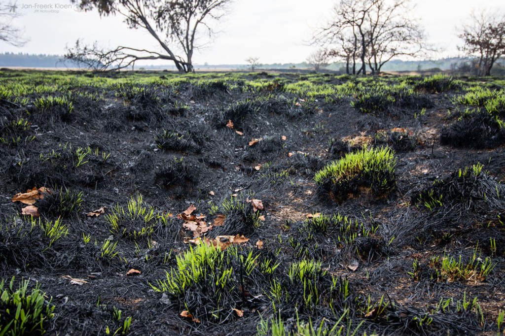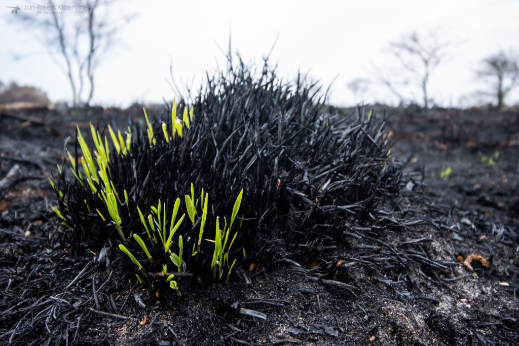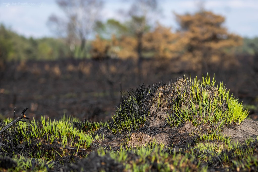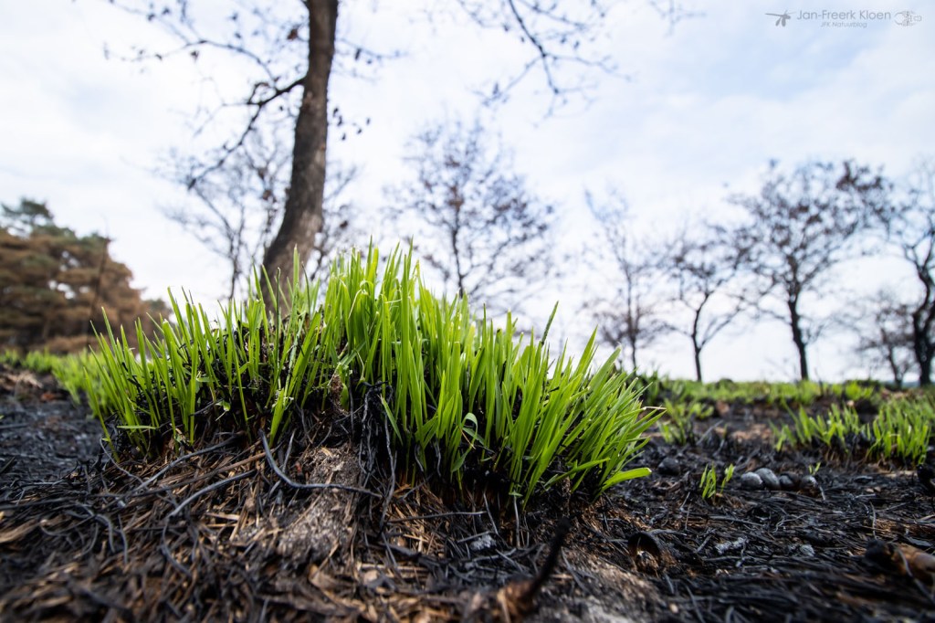 De eerste weg naar herstel is al ingeslagen. Zelfs van grote afstand is op de zwartgeblakerde vlakte al groen te zien. Zeker na de regen van de afgelopen week zetten de grassen, met name pijpenstrootje, een groeispurt in. In noodtempo schiet het groen als paddenstoelen de grond uit. De natuur is niet van plan lang kaal te blijven. Nu is het nog de kunst met het beheer de grassen bij te houden, zodat andere vegetatie ook een kans krijgt een plekje in het hernieuwde landschap te bemachtigen. De grassen groeien met name vanuit de bestaande grote pollen pijpenstrootje. Op het stuk waar oorspronkelijk alleen struikhei, en geen pijpenstrootje, stond is het nog altijd zwart en onbegroeid.