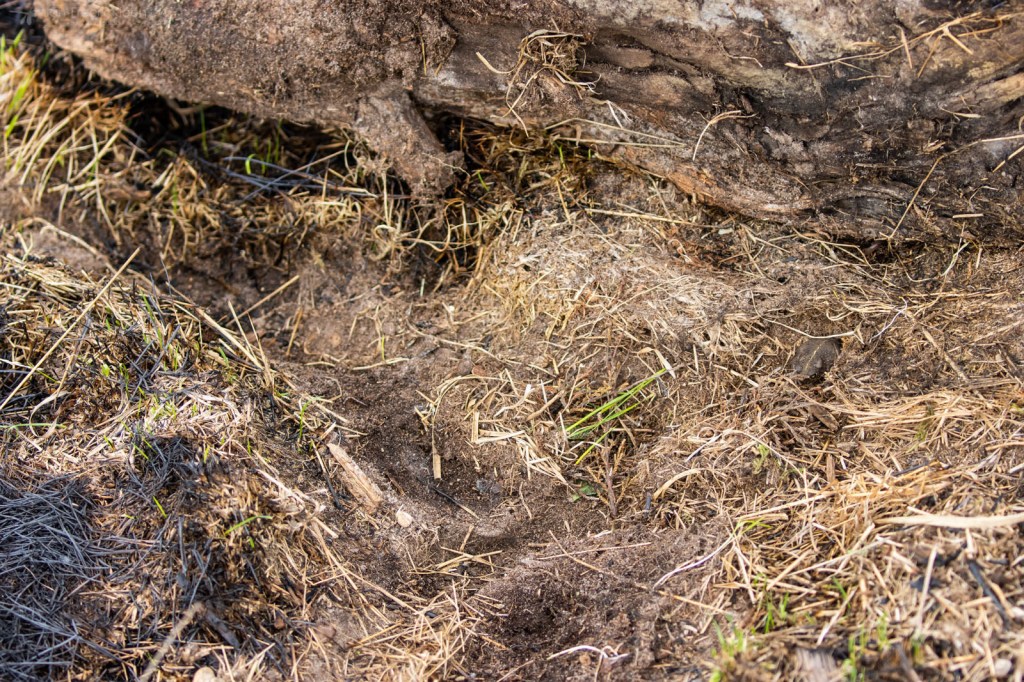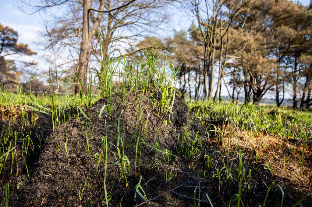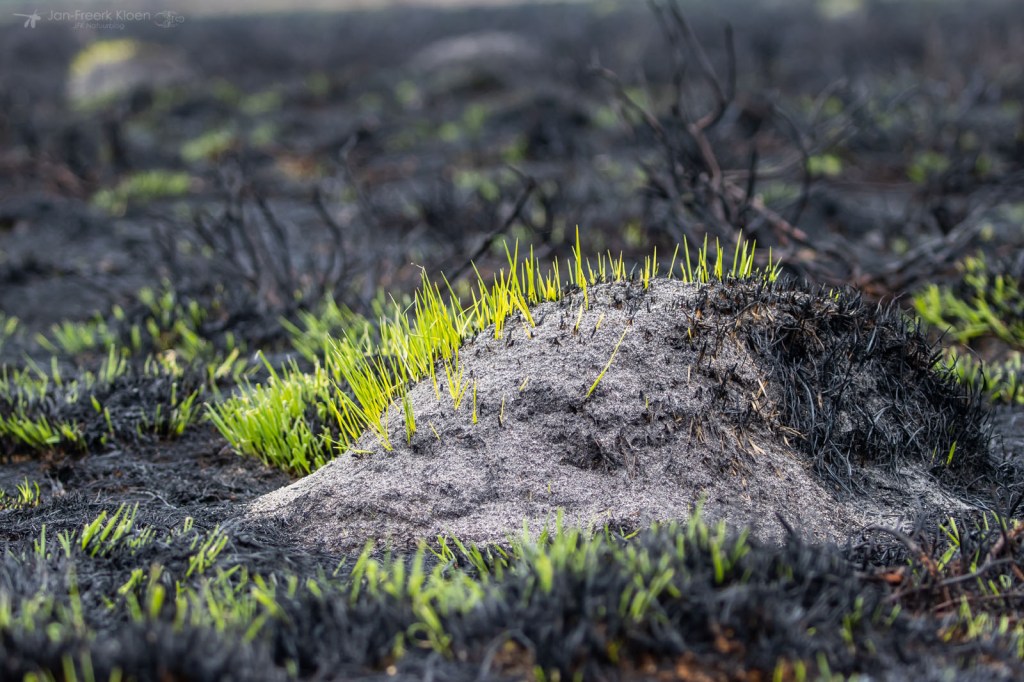Direct na de brand zijn de mieren aan de gang gegaan. Inmiddels is het zand in en rond veel afgebrande graspollen flink omgewoeld door het bodemleven. De zwarte bulten in het landschap kleuren lichtgrijsbruin.