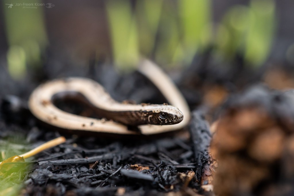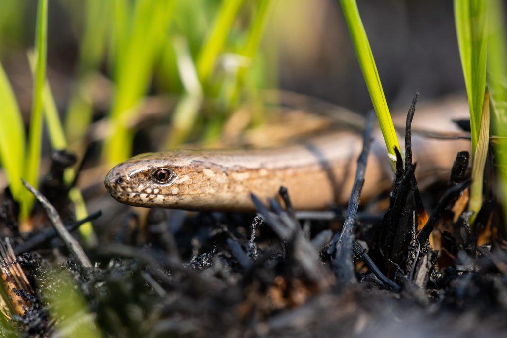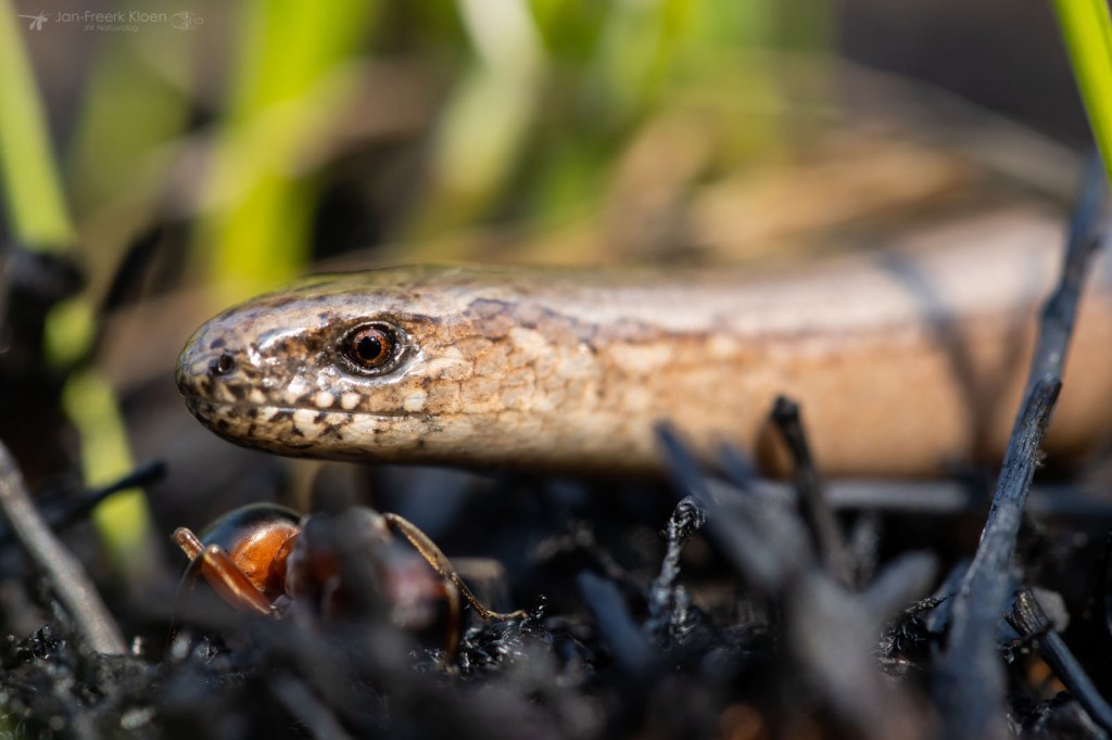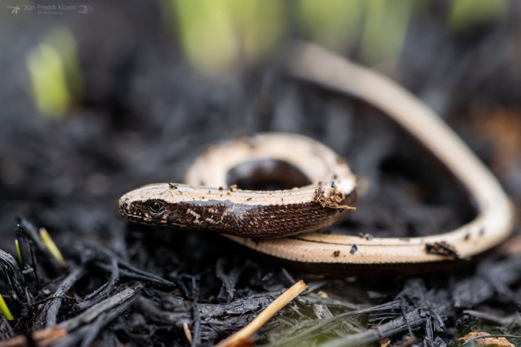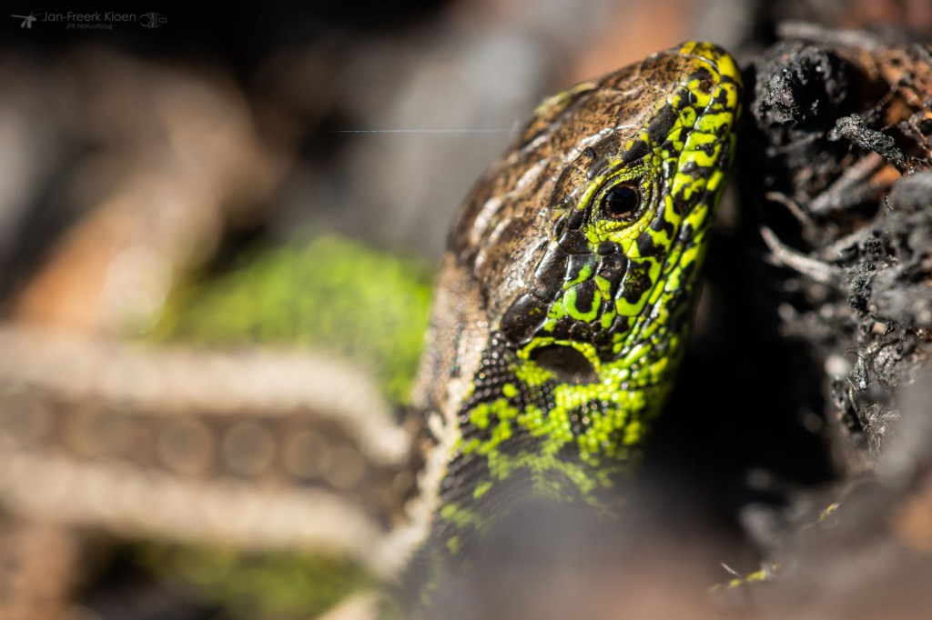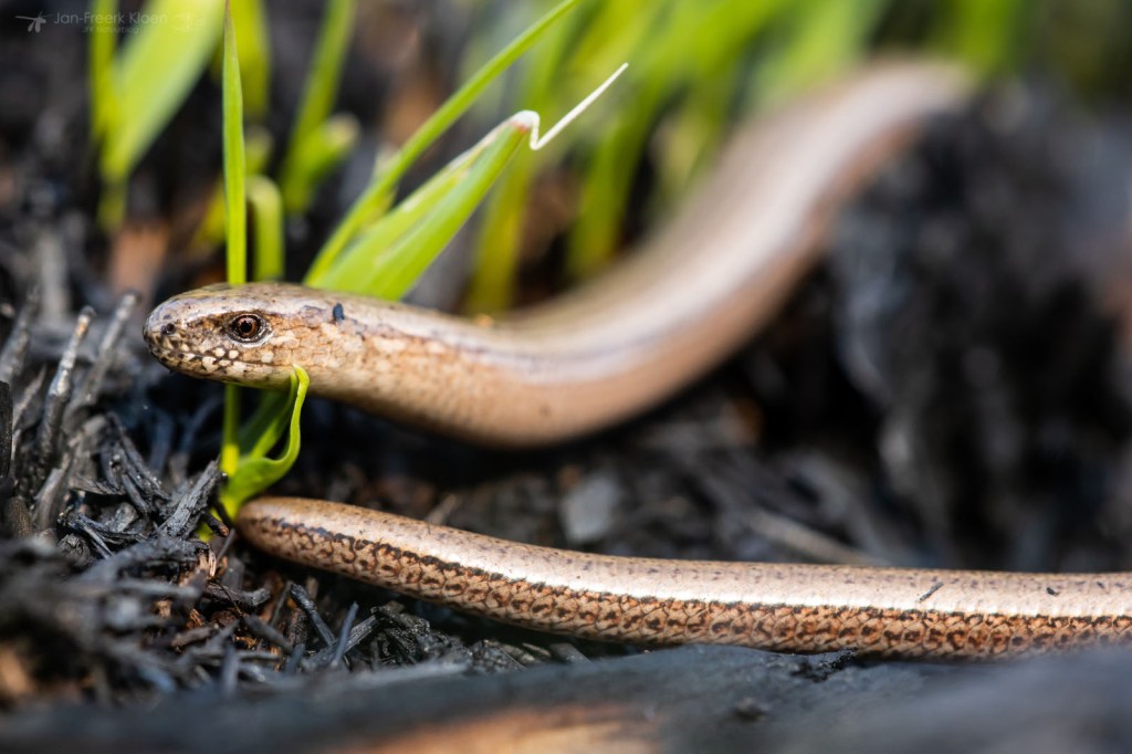 Op 3 april woedde een grote natuurbrand op de Eder Heide waarbij zo’n 75 hectare natuur in vlammen op ging. Een grote zwartgeblakerde vlakte bleef over. Een deel van de knalgroene zandhagedissen overleefde de brand, maar in een landschap zonder beschutting en met weinig voedsel is het een uitdaging om in leven te blijven. Op de verbrande heide kom ik nu dingen tegen die ik nog nooit eerder zag. Een buitenkansje bij mij op fietsafstand.