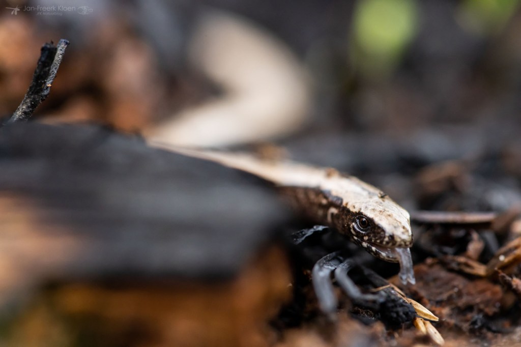 De middag begon bewolkt, de reptielen lieten zich niet zien. Dat bood wel de gelegenheid om onder dood hout te zoeken. Plaatselijk lag veel heel en half verkoold hout. Zolang het hout niet helemaal opbrandde bood het wat beschutting tegen de hitte van de vlammen tijdens de brand. Nu is het een schaarse schuilplaats in het open landschap, waar bovendien nog wat vocht vastgehouden wordt. Ik vond er onder andere blauwzwarte schallebijters (loopkevers) en veel mierennesten. Natuurlijk heb ik niet alle stammetjes omgedraaid om ook een deel met rust te laten. Ook reptielen en amfibieën waren te vinden onder het hout. Een aantal zandhagedissen vond ik er, en enkele rugstreeppadden en gewone padden.