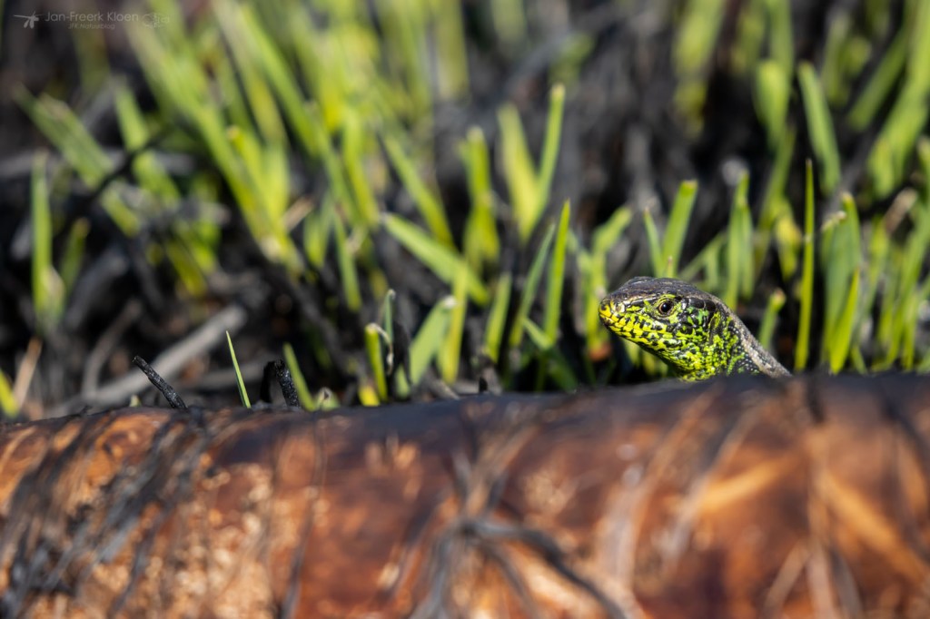 Toen de zon doorbrak waren er opnieuw behoorlijk wat zandhagedissen actief. Veel hielden zich op in de omgeving van dood hout, waar ze meer beschutting en voedsel vinden dan op de kale vlakte. Maar ook midden in het zwartgeblakerde landschap zijn nog altijd zandhagedissen aanwezig.