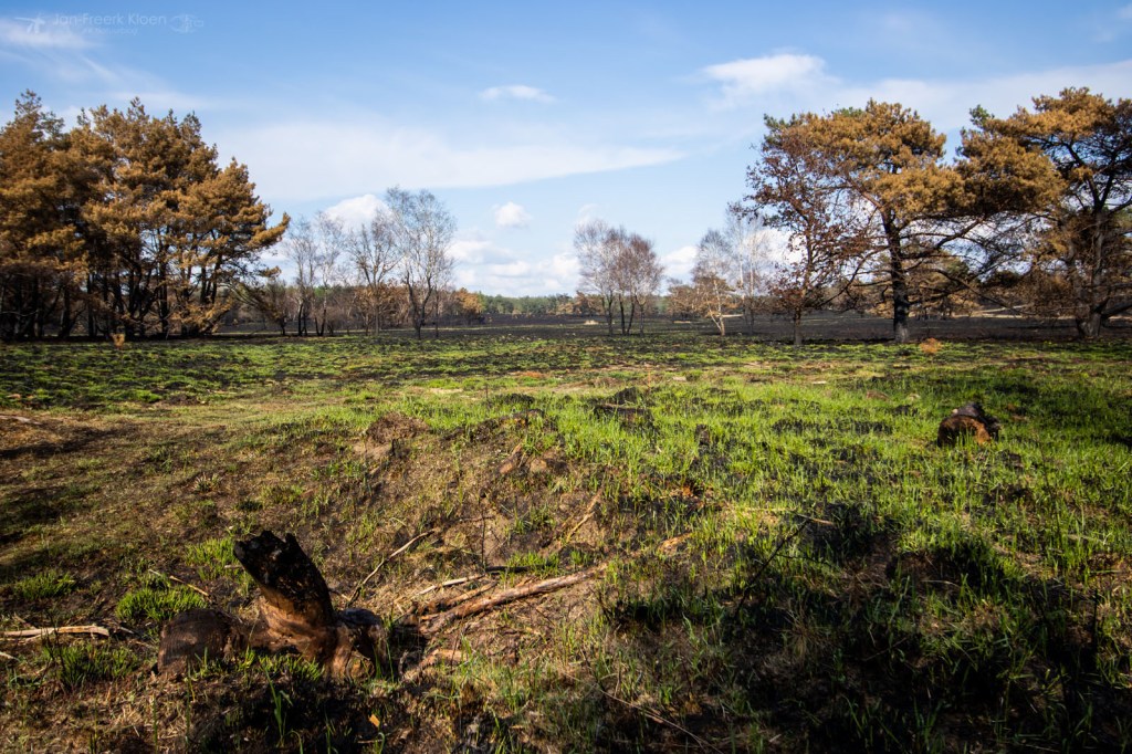 De natuur is snel aan de slag gegaan om aan het herstel te werken. Na de regen krijgen de grassen een kans en zal het gebied snel weer begroeid raken. Daarbij is het nu wel zaak te zorgen dat andere plantensoorten die minder snel reageren en groeien, ertussen kunnen komen. Hopelijk wordt daar goed rekening mee gehouden met het beheer, zodat er een mooi gevarieerd heideterrein kan ontstaan. Ik ben heel benieuwd hoe het gebied er over twee weken uitziet. Vast weer een wereld van verschil.