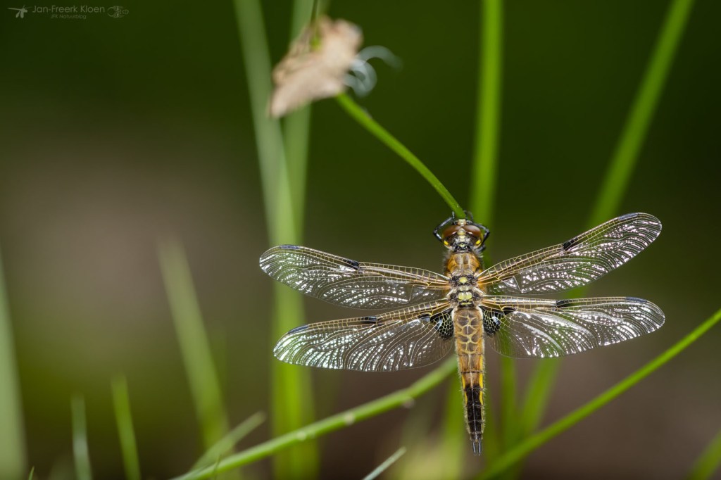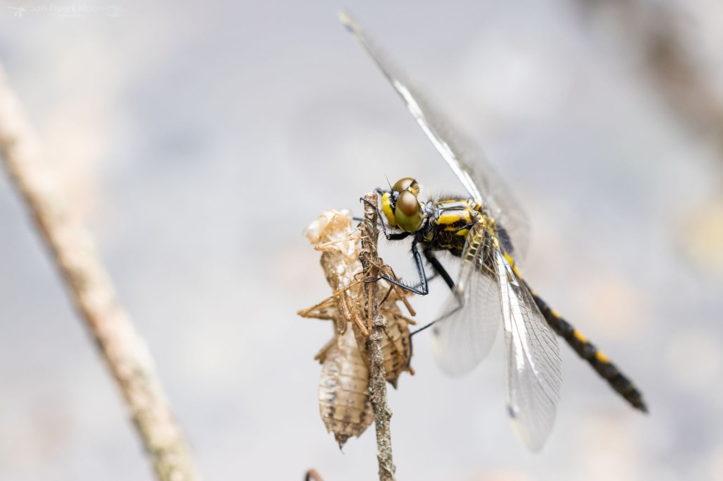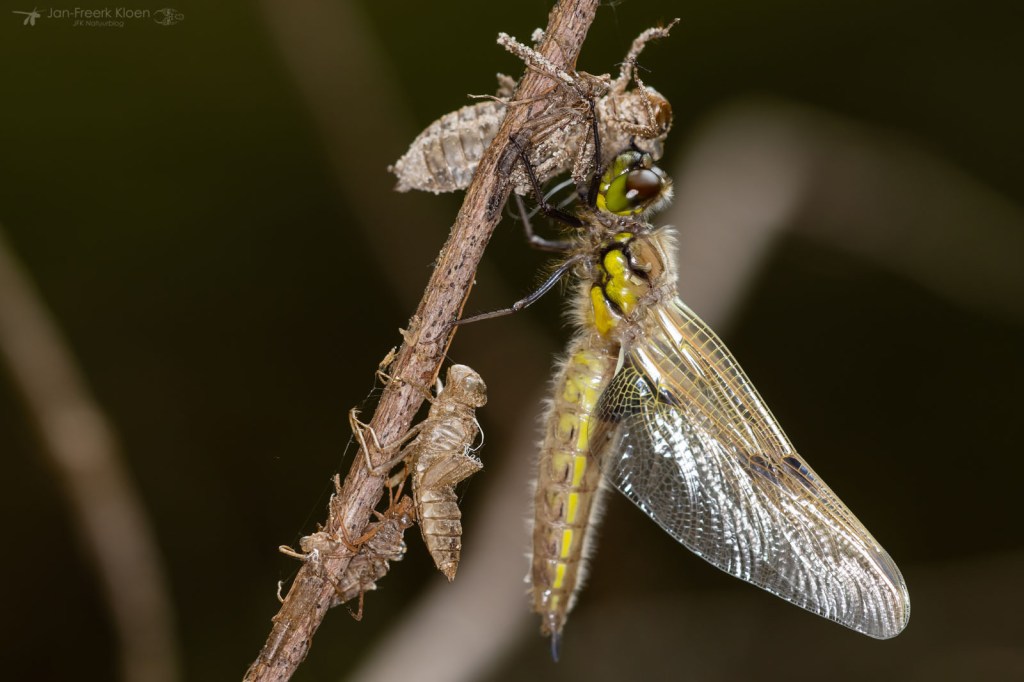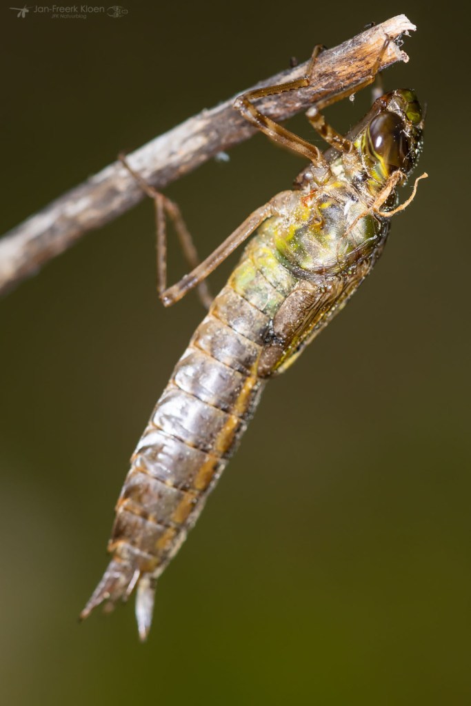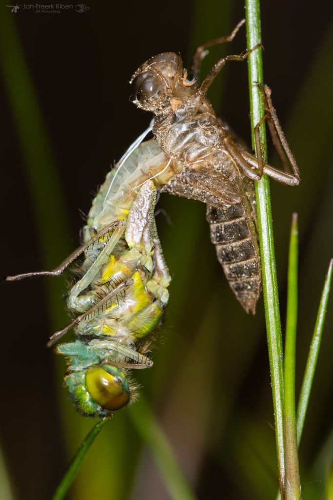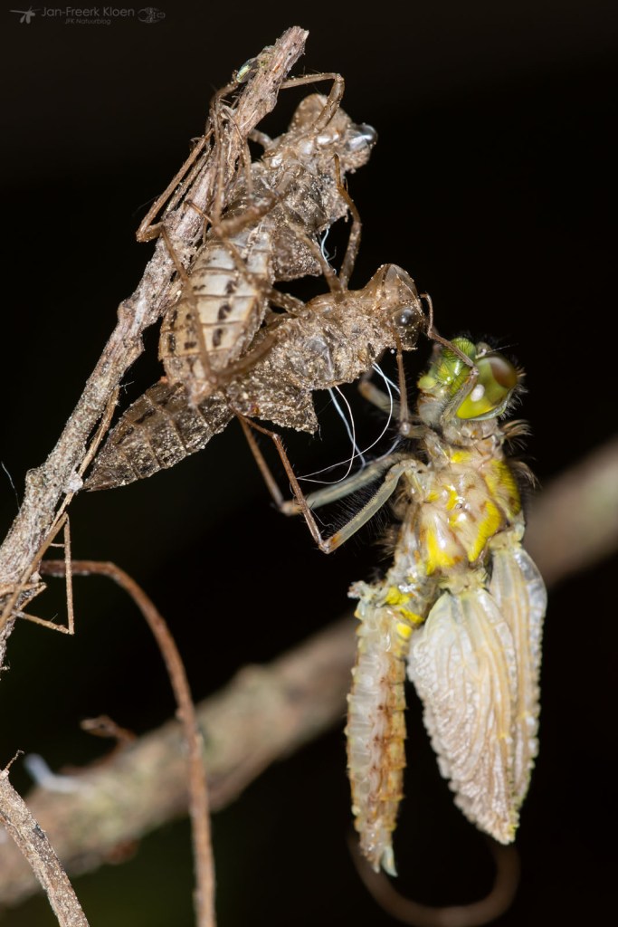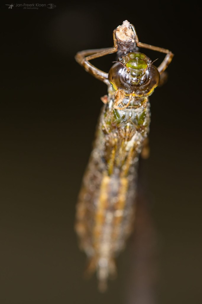 Verspreid over de oever vond ik venwitsnuitlibellen in alle stadia van vervellen. Van een larve die net de kant op kwam lopen, tot een huidje dat net opengebarsten was en de kop van de venwitsnuitlibel naar buiten kwam, tot een volledig opgepompte maar nog altijd kakelverse, glimmende libel. Op dezelfde manier vond ik ook enkele viervlekken en larvenhuidjes van de smaragdlibel en grote keizerlibel. Aan een tak in het water hing een larve van een grote keizerlibel die al wel het water uit geklommen was, maar nog niet was verveld. De meeste keizerlibellen sluipen ’s nachts uit, maar een bewolkte, maar warme middag voldeed blijkbaar ook om een poging te wagen.