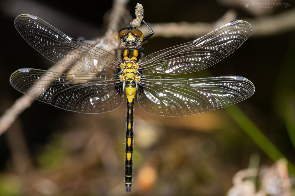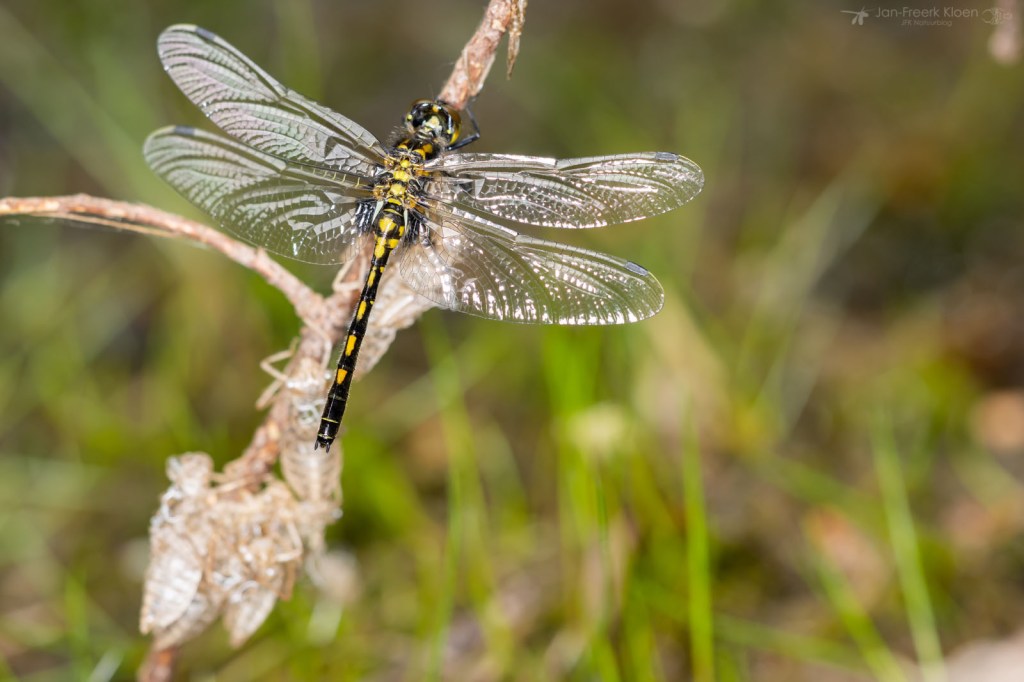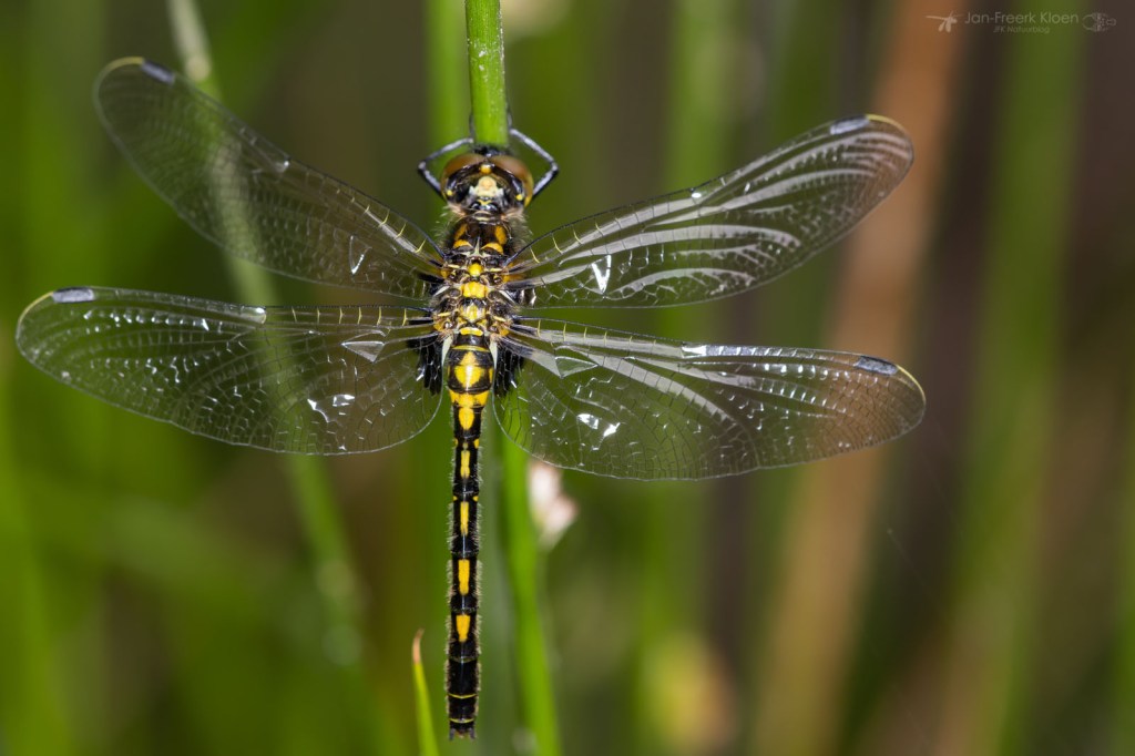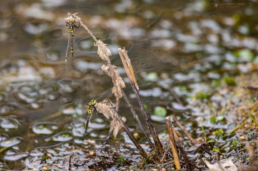 Waar het voorjaar drie weken geleden nog wat moest ontwaken, bleek het gisteren helemaal losgegaan te zijn. Het was bewolkt, alleen enkele smaragdlibellen waagden zich aan een rondje boven het water. Maar onopvallend aan de waterlijn was er ook veel te zien. Al heel snel zag ik een kakelverse venwitsnuitlibel hangen aan een tak die het water uit stak. Het diertje had de vleugels nog niet eens opgepompt. Verderop aan dezelfde tak hing er nog eentje, die had de vleugels wel al grotendeels opgepompt, maar moest ze nog uitvouwen.