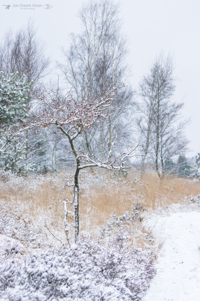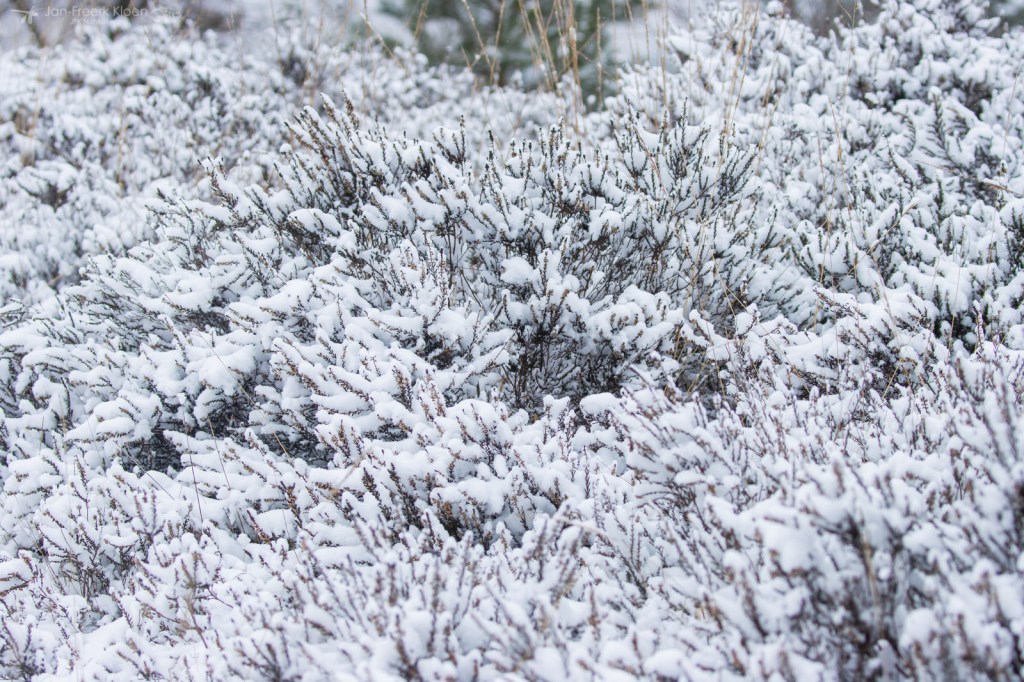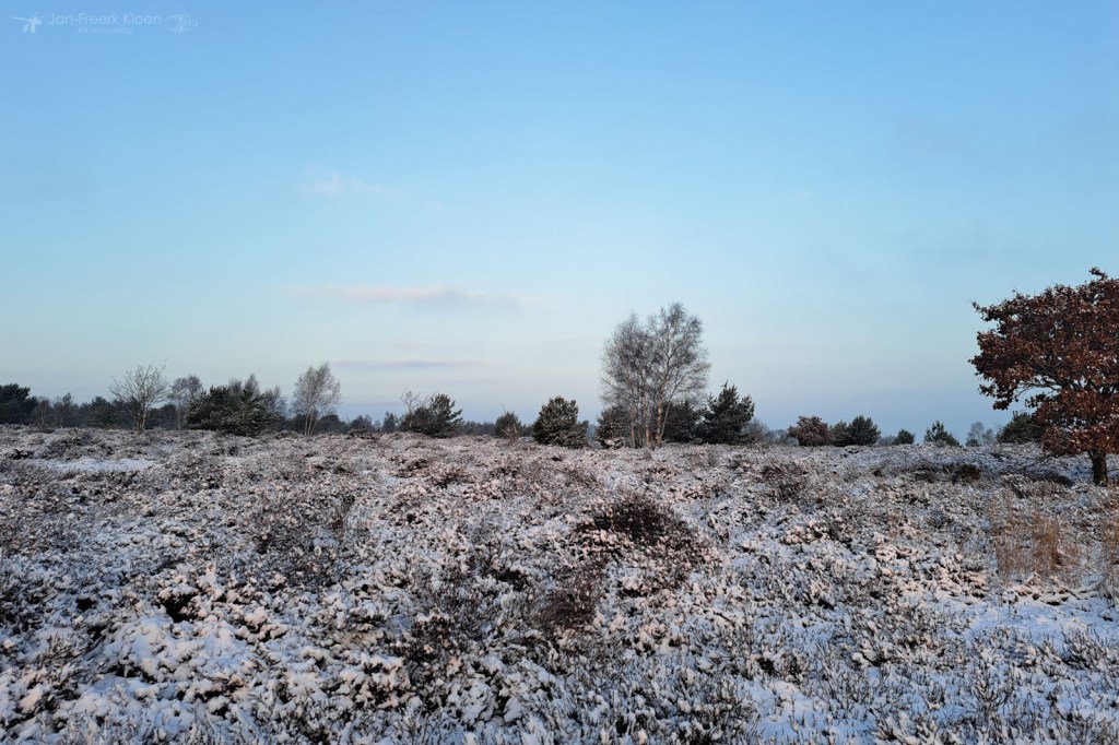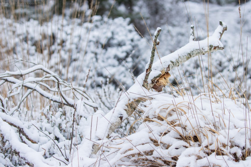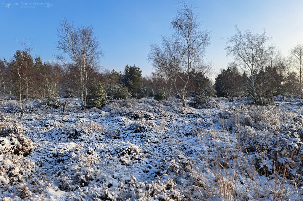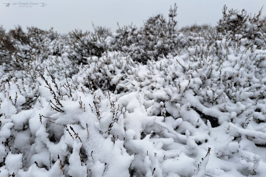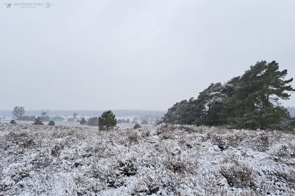 Gisteren en vandaag bezocht ik de Sallandse Heuvelrug opnieuw. Het had gesneeuwd, en gisteren sneeuwde het bovendien overdag nog steeds. Alle vogels hielden zich koest. Bij aankomst zag ik drie korhoenders over de hei vliegen, maar daar bleef het eigenlijk wel bij qua vogelwaarnemingen. Twee beginnende vogelaars kon ik nog erg blij maken met een klapekster in de verte.