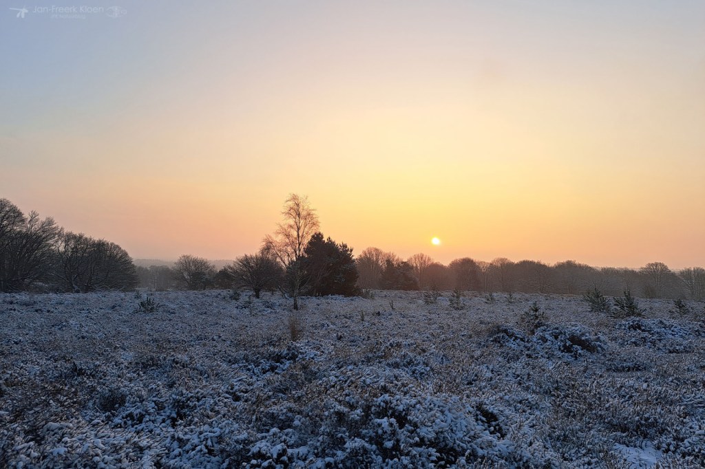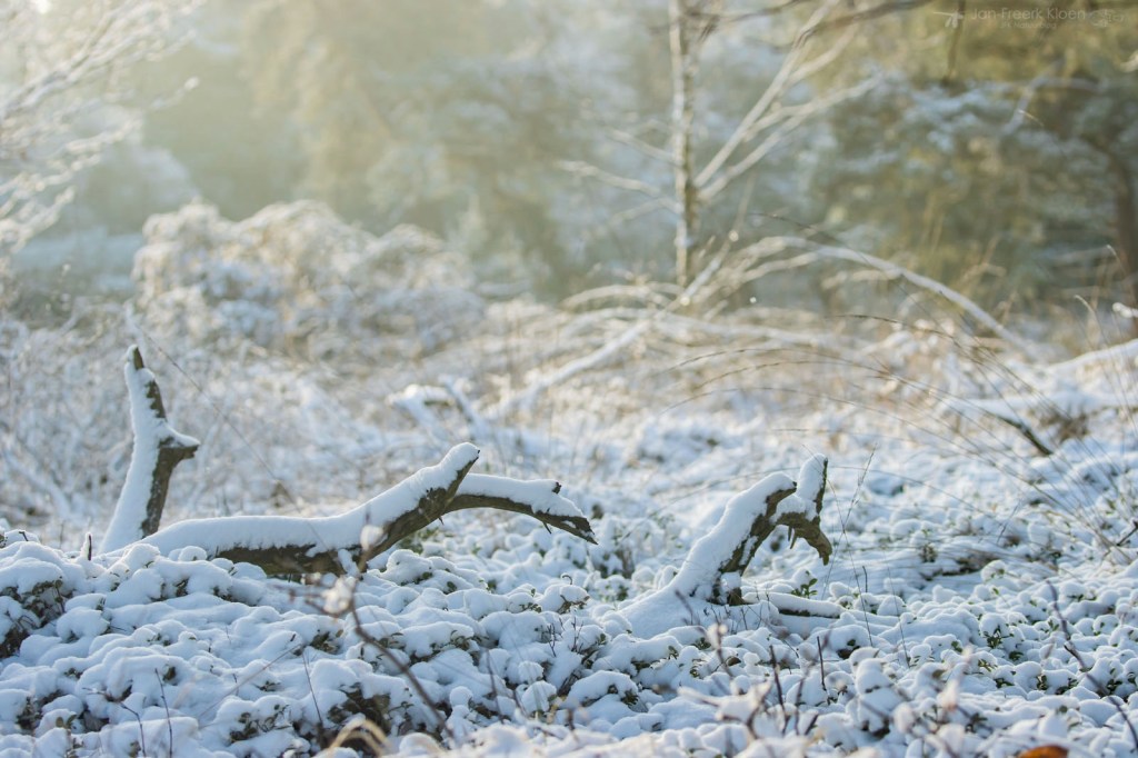 Nog los van deze Zweedse losgelaten kippen was het gewoon een schitterende ochtend om buiten te zijn. Het was flink koud doordat het vroor met een matige oostenbries, maar de zon deed haar best. Het landschap was fantastisch, alsof er iemand met een grote bus poedersuiker langsgekomen was. Alleen is de Sallandse Heuvelrug – met lokale hoogtepunten als de Holterberg, Haarlerberg en Noetselerberg wel een erg hobbelige pannenkoek. De zon gaf alles kleur.
