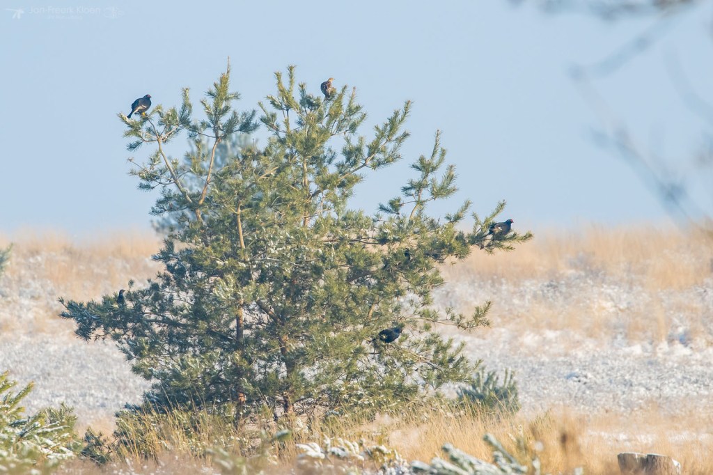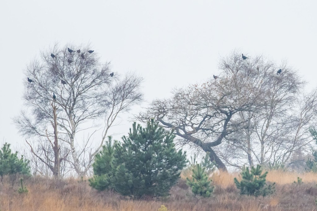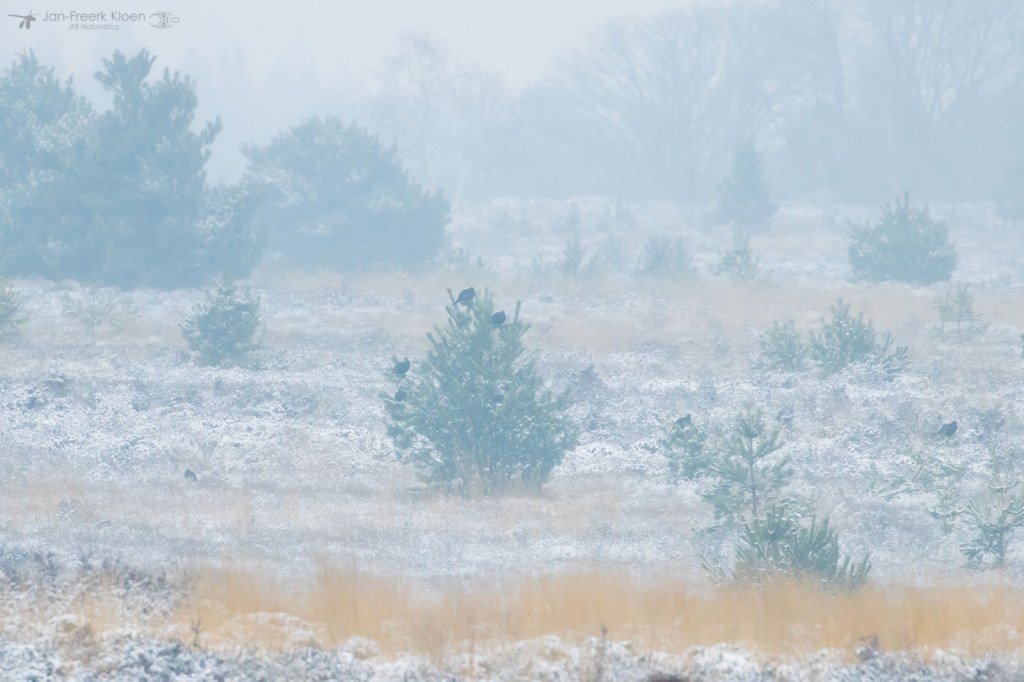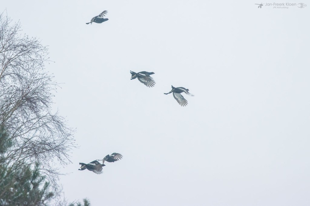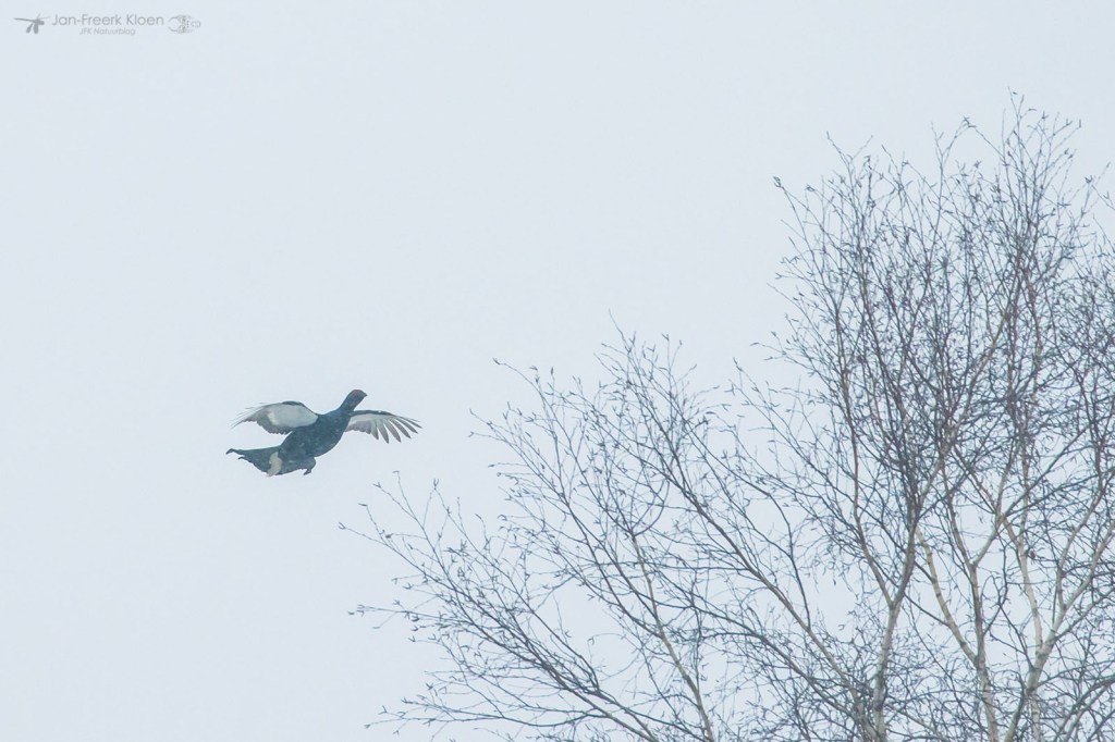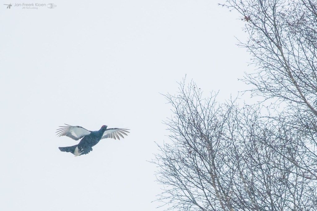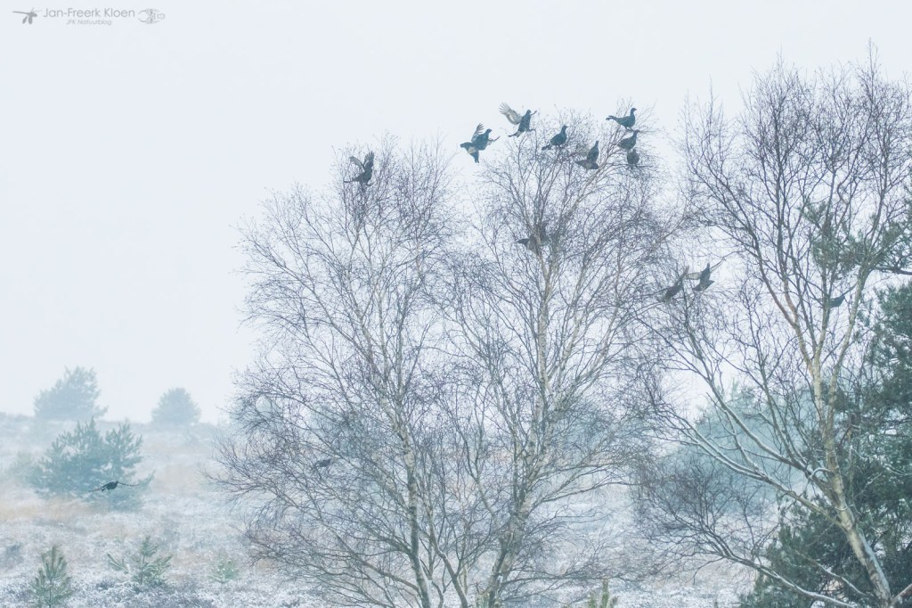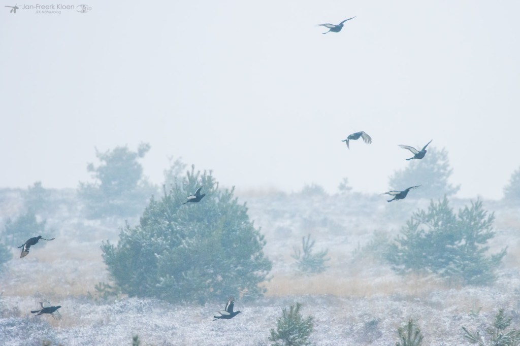 Na een tijdje kwam er beweging in de groep en in delen vlogen ze steeds een boompje verder over de hei. Ik vond dat ze langzamerhand zeldzaam dichtbij de weg door het gebied begonnen te komen, dus ik besloot ze vanaf daar op te gaan wachten. Inmiddels zaten ze in een den op ongeveer 200 meter van de weg. Toen kwam er eentje mijn kant op en landde in een berk op zo’n 100 meter van de weg. Nog voor ik daar echt op kon reageren vlogen er maar liefst dertien hanen op uit de den waar ik er tot dan toe nog maar vijf gezien had en ze kwamen allemaal de eerste achterna. Jammer genoeg was het licht belabberd en werd het zicht verslechterd door de vallende sneeuw, maar zo veel korhoenders op zo korte afstand had ik nog nooit gezien. Het duurde een minuut of vijf voor ze met zijn allen weer ver weg de hei op vlogen.