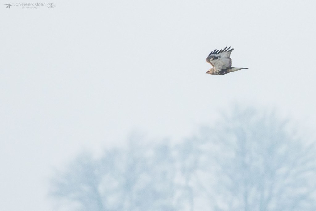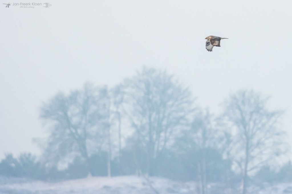 Ik had de plek nog niet bereikt of er kwam een ruigpootbuizerd over de hei langs vliegen. Hij liet zich slechts heel kort zien, maar ik was toch erg blij. Doordat de winters tegenwoordig steeds zachter worden komen er ook minder ruigpootbuizerds vanuit het noorden in Nederland overwinteren. De Sallandse Heuvelrug is ook niet echt een typische plek voor deze soort. Maar goed, ik vond het natuurlijk niet erg.