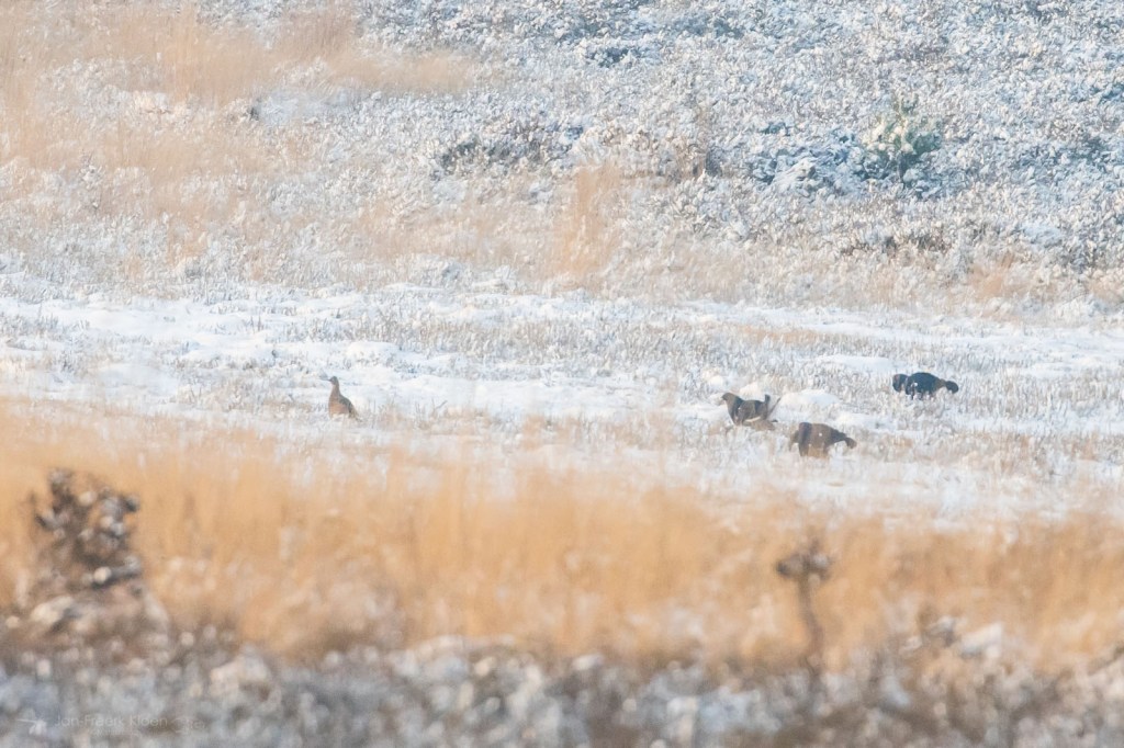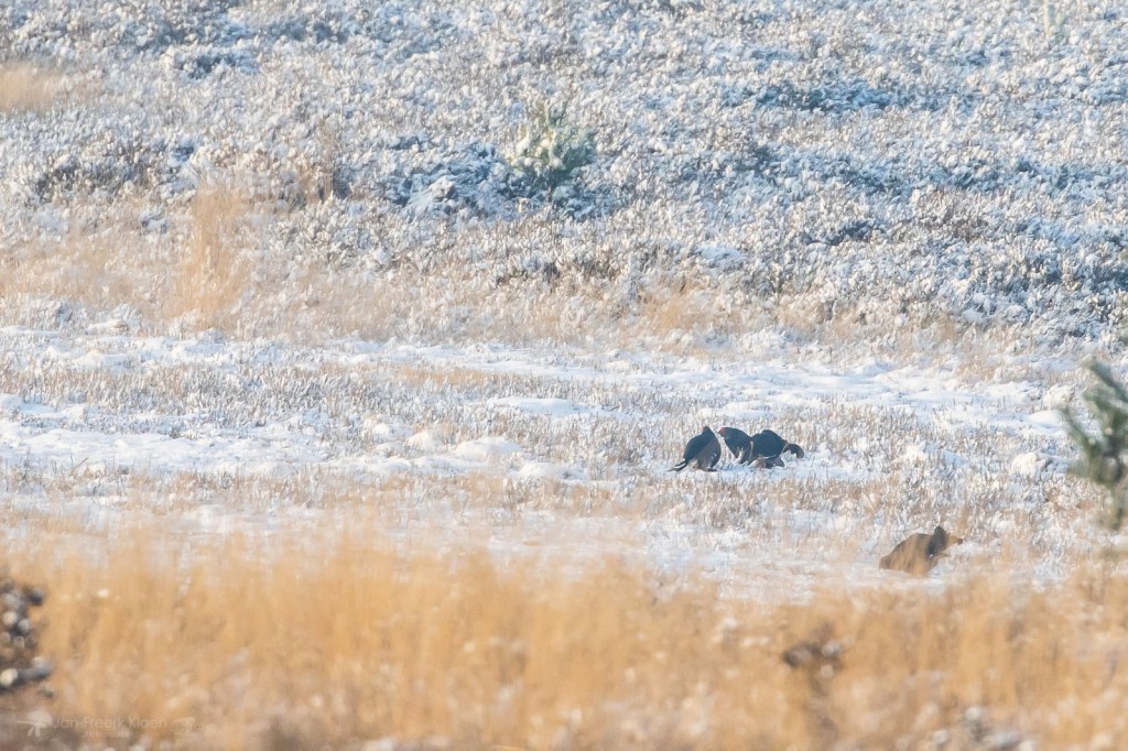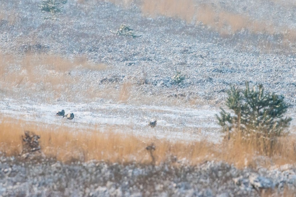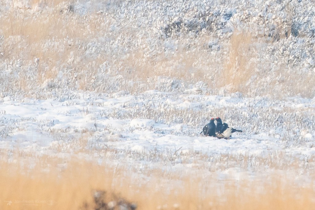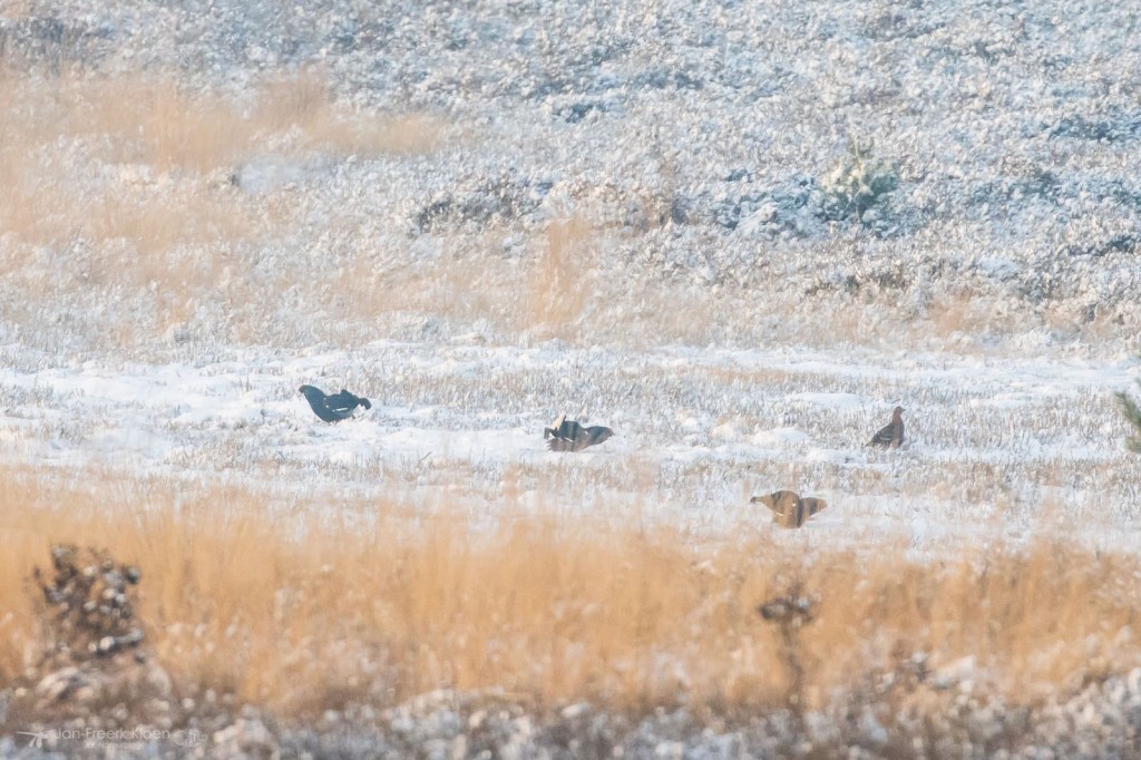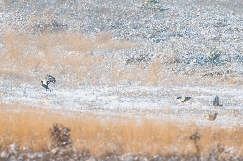 Het ging er nog vrij tammetjes aan toe, maar wat wil je ook in de sneeuw in januari. De hanen liepen wel wat achter elkaar aan en probeerden indruk te maken op elkaar. Op mij lukte dat in elk geval wel. Toen de helft van de hanen opvloog en verdween en er een hen op het toneel verscheen kwamen de hanen wat meer los en werd er wat meer achter elkaar aan gerend en zelfs gevlogen. Het prachtige licht en de sneeuw droegen bij aan de beleving van het schouwspel dat zich op zo’n 200 meter afstand afspeelde.